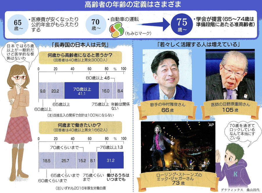 *「円熟」「威厳」の意味も 東京都立桜修館中等教育学校の荒川美奈子先生の話 江戸幕府には幕政を統括する老中を助けて江戸城の警備や旗本・御家人の統制を担当する若年寄という役職がありました。老中や若年寄らは合議で政治方針や施策を決定し、将軍はそれを承認するのが原則でした。老中や年寄とあると、高齢の人しかなれない役職に見えますが、「老」や「年寄」には、円熟や威厳などものごとに精通しているという意味があります。責任ある仕事を任せられる経験値を表す年寄という職名は、江戸時代の村役人や相撲の親方の資格などにも使われています。定年延長が当たり前になった現在、知識と経験を生かして仕事をしている人々に圧倒されることも少なくはありません。さて、若年寄には年の割には活気がないという意味も。若い皆さんは、丸めた背筋をしゃっきり伸ばして、元気に新学期を迎えましょう。 2016-12-26・・・信濃毎日新聞より引用 ●高齢者は資産か負債か 小倉和夫氏曰く、女性差別、身体障害者差別、精神障害者差別、性同一性障害者差別、外国人差別-そうした差別を解消しようとする動きは世界的な広がりを見せているが、では高齢者差別ないし忌避(きひ)はどうであろうか。そもそも、現代は若さ礼賛(らいさん)の時代だ。加えて、社会に閉塞感があるだけに、改革の担い手に若者を、というスローガンが通りやすい。そして、高齢者はとかく福祉や介護の対象、すなわち社会にとって一種の「負債」と見なす傾向が見られる。 だが、高齢者は本当に社会にとって専(もっぱ)ら負債なのであろうか。確かに、高齢者はある意味では面倒をかける弱者だろう。年を取れば取るだけ、年齢からくる衰えと戦わねばならない。しかし、まさにそこに、若者とはまた違うエネルギーがわく。ヘミングウェイの傑作「老人と海」も、老いた漁師が必死に巨大な魚と撃つ物語だ。そこには、老いにともなう孤独と、体力の衰えと戦う戦闘心がみなぎっている。 イギリスの詩人コールリッジの幻想的な詩「老水夫行」も、ある意味では、自分を助けてくれたアホウドリを殺した過去の自分との戦いの物語だ。また、うば捨て山伝説などでも、老人の知恵が人々を救う意味も込めれている稀でもない。「年を重ねると皮膚よりも心に皺(しわ)がよる」という、フランスの作家モンテーニュの警告を受けとめて、高齢者が意固地にならず、いつまでも柔軟でいれば、老いは社会の負債ではなく資産となりえよう。もし、若さを礼讃する真の社会的意味が、(未来に貢献する)意欲と(今を守る)勇気を刺激することにあるのならば、少子化と安全指向に陥っている日本では、高齢者の知恵と勇気を改めて評価することも、社会的意味があるのではなかろうか。 2017-12-05・・・信毎夕刊より引用 ●不老長寿は道徳的? 現実化する「老化の克服」 不老長寿といえば、古今東西を通じ、変わらぬ人間の願望。そのため神話や物語、小説などでも繰り返しテーマとされてきた。今日でも「アンチエイジング」関連の商品やサービスが売れている。かなわぬ夢だと知りながら、それでも求めざるを得ないわけだ。ところが、現代のバイオテクノロジーの発展によって、その夢が実現されるとしたらどうだろう。英国の科学者オーブリー・デ・グレイ(1963年上は、「遺伝子工学で老化に打ち勝つための核となる知識は出そろった」と述べている。実際、動物実験の段階では「若返り」が可能になっているとも言われている。 人間の平均寿命を考えてみると、20世紀初めの米国で48歳だった。「人生50年」という、かつての言葉も想起される。ところが、近年では100歳近くまで健康な老人が少なくない。今後、遺伝子テクノロジーが進展していけば150歳、さらには200歳まで健康に生きられるのかもしれない。それどころか、米国の発明家レイ・カーツワイル(48年〜)は、500年や1000年も不可能ではないと語っている。しかし、バイオテクノロジーによる「老化の克服」が現実的になって、むしろその技術への不安が語られるようになってきた。人間が長寿になれば、人口過剰にならないか。 長い人生では記憶もまばらになって、人格の同一性が欠如しないか。長過ぎる人生に私たちは退屈するのではないか。他にも、健康維持費用の増大や不公平性の問題などが想定される。こうした反論が提出.される中、英国の哲学者ジョン・ハリス(45年上は、「不老長寿」に対して積極的な賛成を表明している。医療で生命を救うとは、死を先延ばしにすることを意味する。こうした医療が望ましいとすれば、死の延期、すなわち「生命の延長」も望ましいはず。したがって、ハリスによれば、人間には不老長寿を進める「道徳的命令」が課されているということだ。私たちが今後、不老長寿の道を歩み始めるのは間違いなさそうである。(玉川大教授) 2017-12-25・・・日経より引用 ●長生きの秘訣、運動・絆・医療 *転倒しない体づくり *地域とのつながり *医師