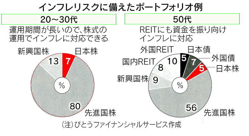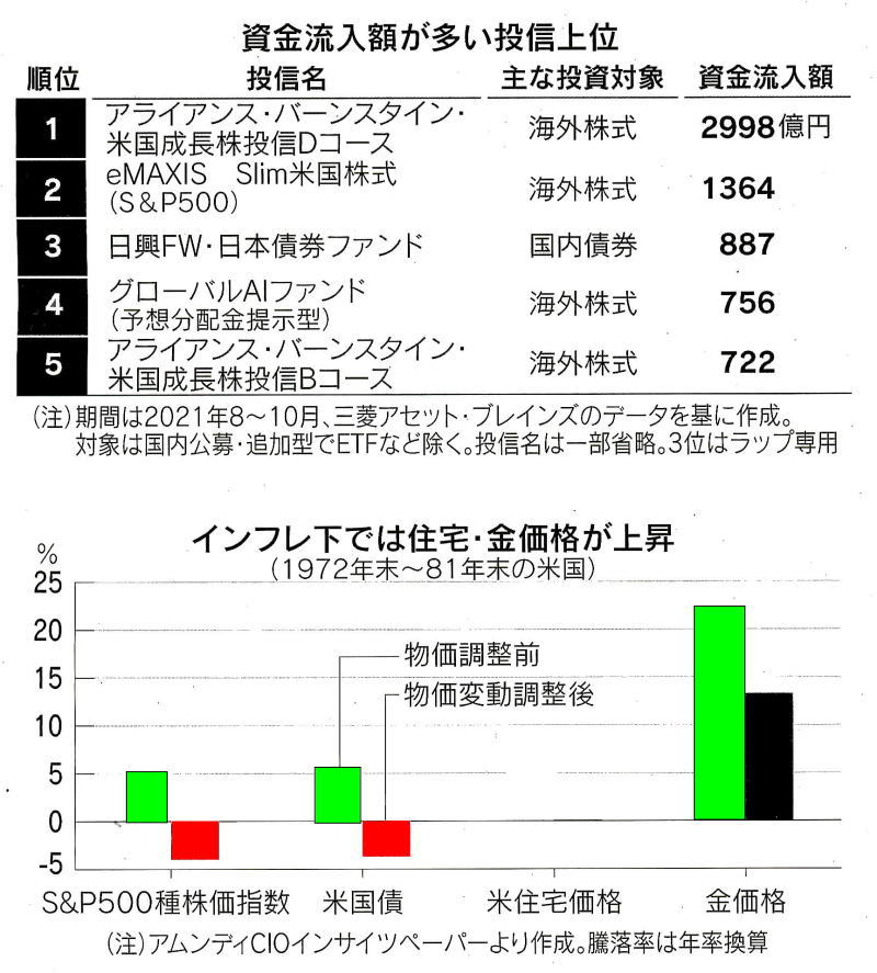 2021-11-20・・・日経より ◆資産運用、インフレに備え 株が中心、REIT・金も デフレに慣れてしまった日本の投資家だが、長期の資産運用ではインフレ局面が訪れる可能性もある。日銀が発表した10月の企業物価指数は前年同月比8・0%上がり約40年ぶりの伸び率となった。一部の食料品の値上げが始まっており、消費者に身近な最終製品にどこまで広がるかが焦点となっている。株式や投資信託を中心に物価の安定を前提に運用を考えてきた人も、これを機に物価高に備えた投資を考えてみよう。 東京都在住の30代のAさんは米国の成長株中心に長期の運用を目指す。来るインフレが長引く.との懸念から株価が下落した局面では「物価高に強いといわれている金への投資も検討した」と語る。日用品やサービスなどの値段が持続的に上がるのがインフレだ。10%のインフレならば、今まで20万円だった生活費が22万円になる。賃金も同じく10%増えないのであれば、家計にはマイナスだ。インフレ下ではモノの価値は上がる反面、お金の価値は下がる。 現金を持っているより、他の金融商品で持つ方が優位になりやすい。デフレを意識してきた先進国の中央銀行や投資家は一転してインフレリスクを懸念している。岡三証券の松本史雄チーフストラテジストは「脱炭素の潮流のなか化石燃料への開発投資が減り、資源価格高騰は長引く可能性がある」と指摘する。 資源高から物価上昇は長く続くとの見方も広がる。物価上昇と景気低迷が同時に起きた1970年代のスタグフレーションの時、米国の株や国債による運用は苦戦した。仏運用大手アムンディの資料によると72年末〜81年末の物価変動調整後の資産別騰落率(年率換算)は金と不動産がプラス。株や国債はマイナスだった。 最近の投信の資金流入上位には米株投信が並ぶが、70年代のようなスタグフレーションの局面では「不動産や商品など、物価上昇への耐性が強い資産を保有したほうが運用の安定性は高まる」 (ピクテ投信投資顧問の松元浩グローバル資産運用部長)。個人投資家が投資しやすいのは上場商品が豊富な不動産投資信託(REIT)だ。投資家から集めた資金を不動産に投資し、賃料や売却益を分配する仕組みの商品だ。 売買手数料や管理費は実物の不動産に投資するより少ない。初心者ならば、国内REIT全体に分散投資するREIT投信がバランスがとれていて手軽。純資産額が現在トップの大和アセットマネジメントの「ダイワ1-REITオープン(毎月分配型)」などがある。海外REITという選択肢もある。国内REITの投資先はオフィスやホテルが大半だが、海外ではインフラ、データセンター、森林などに投資するREITもあり「幅広く投資するのでリスク分散できる」 (楽天証券経済研究所の篠田尚子ファンドアナリスト)。 インフレが一定範囲内にあり景況感もよければ、株式投資には物価上昇による資産の目減りを防ぐ効果がある。インフレの背景に活発な経済活動があるならば、企業は製品やサービスの価格を上げられるため収益が大きくなり株価は上がりやすい。20〜30代が長期投資をするなら、インフレ対策は株式投資で十分との声が多い。独立系金融アドバイザー(IFA)のファイナンシャルスタンダード(東京・千代田)の代表を務める福田猛氏は「企業はたとえインフレ時に価格転嫁が追いつかず、一時的に業績悪化しても、その後は回復する」と説明する。 運用期間が長ければインフレ局面の損失をいずれ取り戻せるとの考え方だ。資産運用アドバイザーの尾藤峰男氏は年齢が上がればREITに一部資金を振り向けることを勧める。「40代以降はインフレが長期化した場合のダメージを抑える必要がある」 (尾藤氏)ためだ。原油や金など商品もインフレに強いとされる。 お金の価値が下がるインフレ下では、金などモノの価値が上がると考えられるためだ。金の実物だけでなく、投信で投資する方法もある。商品相場は実需の変化や投機的売買によって、大きく上下することがある点に注意が必要だ。原油先物だけなど単独の商品に投資すると思わぬ損失が出かねない。 「eMAXISプラス コモディティインデックス」のような幅広い商品の値動きを反映する投信のほうが、分散効果が働いて基準価格の振れ幅を抑えることが期待できる。各資産の性質を知って、インインデックス」のような幅広い商品の値動きを反映する投信のほうが、分散効果が働いて基準価格の振れ幅を抑えることが期待できる。各資産の性質を知って、インフレに強いポトトフォリオをつくろう。 (近藤パドリック)