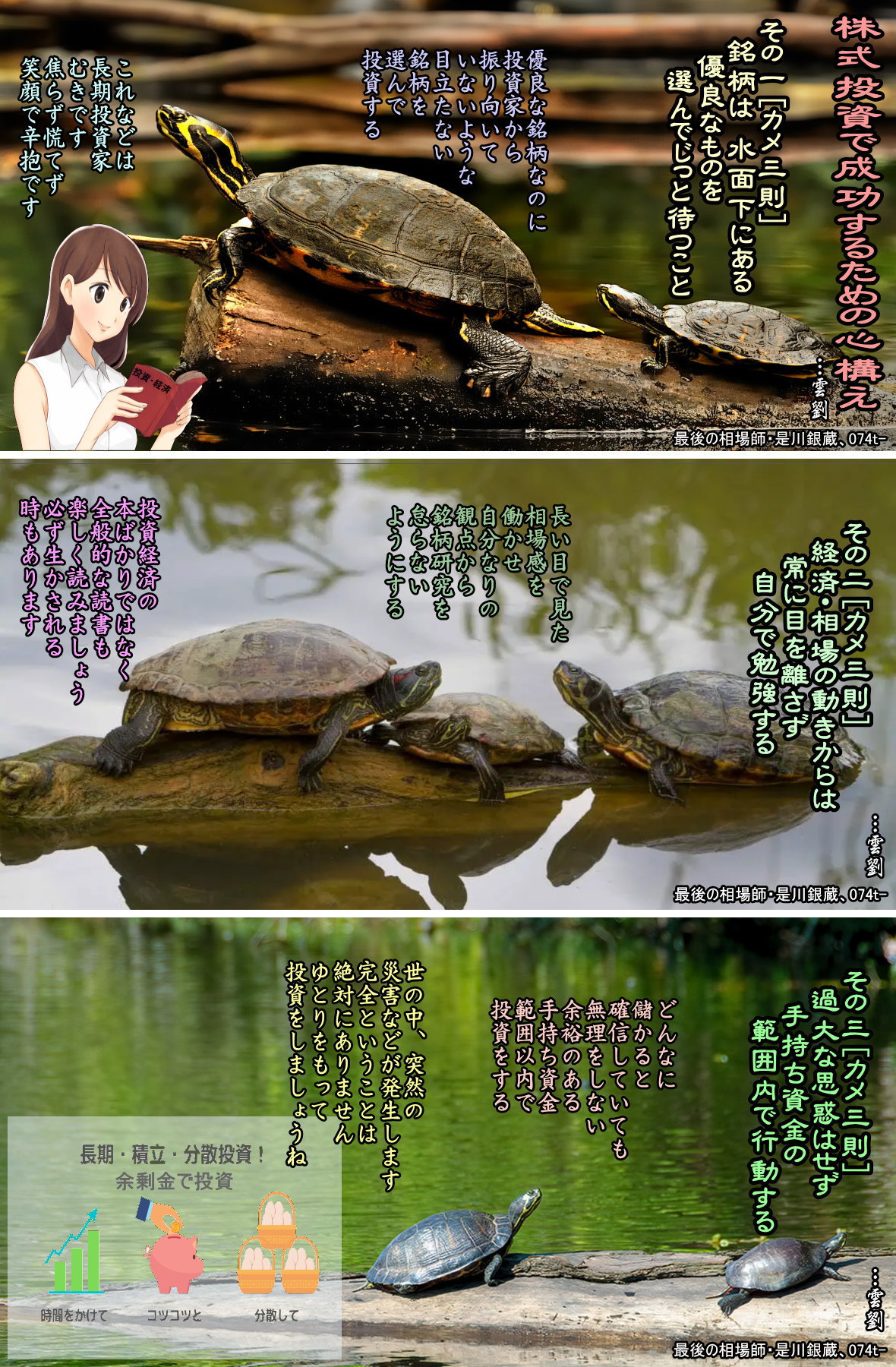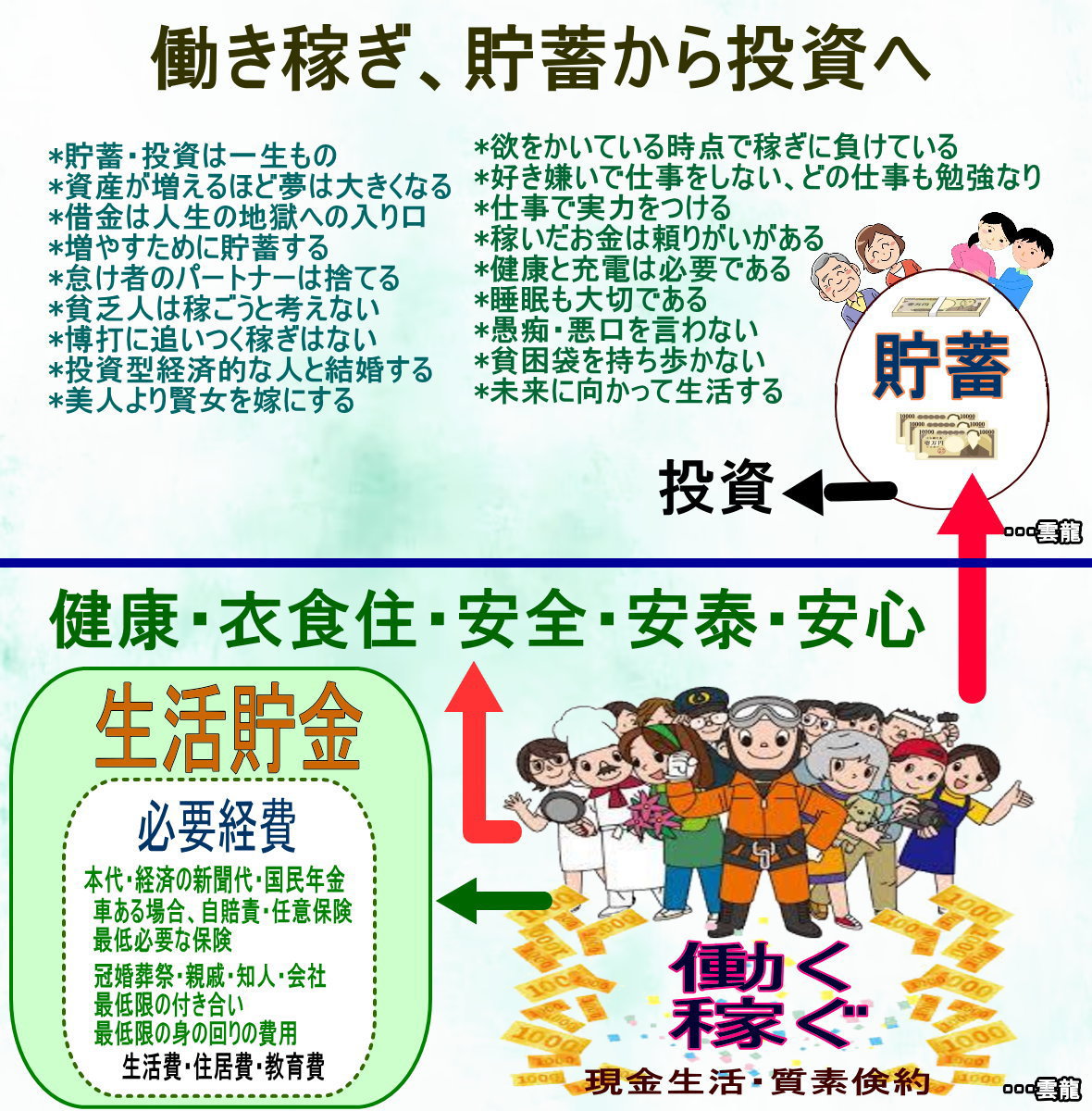 2003-01-01 ◆自分を投資相場向きにする 仕事でも投資でも働こうが遊ぼうが怠けようが、自分という存在があって自分の意志によって出来る技である。人に使われてする仕事は言いなりなって言われたとおり仕事をしていれば最低の賃金は頂ける。真面目に勤めていても、たかがしれている賃金に甘んじた生活しか望めないだろう。贅沢は云わない、人の生活を羨まないと割り切って働いた賃金だけで生活していれば十分だというなら、どうのこうのと人様から言われすじあいはないだろう。だが、そんな生活をしていては生活レベルは生涯上がらない。世間一般の生活は望めない。哲学も投資経済の知識も無く欲を丸出しにガツガツ博打的に金儲けをしようとしても儲かるものではない。 株式市場とは、損を薄く広く分散させるためのシステムである。そのカラクリをある程度勉強して、投資して「儲けた」と幸福感の悦に酔ったり。自分には金儲けの能力があるのだと自分を自慢する。「損した」時は自分は運が悪く不幸なのだと、人の儲けを気にしたりして相場が悪いと勝手に判断する。こんなことを繰り返しているだけで自分の大切な時間の無駄遣いで相場に操られている相場の奴隷であり、損得に拘っていると自分の幼児性が露出して相場のカモになるだけである。そんなことにならないためにも、自分の性格を理解してどうすれば良いか解析してから自分というものは「自分は自分、人は人」ということを自覚して、相場を追いかけるのではなく先行で相場感を読み取り株式相場に接していけば自分の相場となるだろう。 株投資をするには、コツコツとスローペースで楽しく過ごす中でするのが良いだろう。株を売却して儲けた時は、市場が儲けさせてくれたことに感謝する気持ちが大切である。投資する前に投資の勉強する以前に「精神的に自分自身」を鍛えてから投資世界に足を踏み入れていくべきかなと思う。そうすれば投資相場で損得に振り回されなく次ぎ次ぎと難問が訪れも策を練る事ができるだろう。自分を理解して対策をすれば「自分らしい投資法」が確立されるでしょう。1000人の投資家がいれば1000通りの自分らしい投資法が存在しても不思議ではないでしょう。著名な投資家の方法を参考にして相場波に乗って投資している人は是非とも「自分らしい投資法」を見つけましょう( ^_^)/ o(^o^)o \(^_^ )。 ◆お金は働かせてこそ意義あり