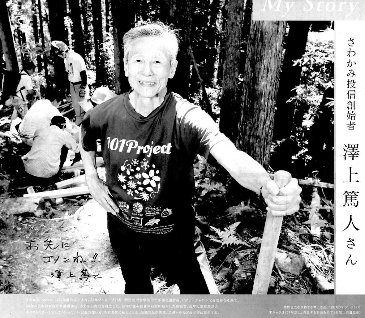 澤上篤人(さわかみあつと)、1947年愛知県生まれ。73年ジュネーブ国際・開発研究大学院終了、ピクテイ・ジャパン代表取締役を経て、1999年日本初の独立系運用会社、さわかみ投信を設立した。日本に長期投信の理念を紹介した先駆者。近年は資産運用のネクストステージとして「かっこいいお金の使い方」を次世代に伝えようと、伝統文化や芸実、スポーツなどの支援に奔走する。 初夏の木漏れ日が降り注ぐ熊野古道。土のう袋をかつぎ、会社の仲間らと傷んだ道の修繕作業に汗を流す澤上さんの姿があった。土をバケツリレーのように運び上げ、傷んだ区画に敷いて固めていく。東京から飛行機と車を乗り継いで半日かかる熊野三山の深い森での地道な修繕作業は、かれこれ50回を超える。なぜ資産運用会社がボランティアに力を注ぐのか。「資産運用にとっては日々の暮らしを支えるお金を殖やすことも、世の中を良くするためにお金を使うことも、どっちも大切なことなんよ」。 独特の柔らかな「澤上節」で、そんな答えが返ってきた。日本に長期投資の理念を伝えた先駆者が行き着いた、お金に対する美学は、多額の借金に苦しんだ子供時代から培われてきた。父親は様々な事業を手がげろ実業家で、新たに製材や住宅建設の事業を営むため、7歳で長野県に引っ越した。戦後の混乱期にもかかわらず、恵まれた暮らしぶり。だが17歳の時に父親が急逝して事業が行き詰まると膨大な借金だけが手元に残された。 *父の急逝で抱えた借金、返済のため欧州へ出稼ぎ やむなく京都にある母方の実家に身を寄せ、高校卒業と同時に働き始めた。だが「高卒の給料じゃ、ちっとも借金が減らんのよ」。そこでアルバイトを続けながら大学に進学を果たす。卒業後は大手電機メーカーに就職したが、それでも借金を返しきれない。この先どうしたものかと思いあぐねていたところ、こんな話を耳にする。「欧米で働いたら、日本の10倍の給料がもらえるらしいぞ」 行動は早かった。 1年足らずで会社を辞めると、奨学金を片手に、スイス・ジュネーブの大学院に旅立つ。頭にあったのは「一刻も早く借金を返したい」という切実な思い。だから現地に着くなり、アルバイト先を探し始めた。そこでの選択が人生の転機になる。働く場として選んだのは、米資産運用大手へキャピタル・グループの欧州本部。しばらくすると働きぶりが評価されて社員に登用され、アナリスト兼ファンドアドバイザーとして世界の富裕層と交わる機会を得た。 キャピタルで学んだのは、お金に対する美学だ。まだ日本で知られていなかった長期投資には、単に資産を長く運用するだけでなく、幾世代にもわたって100年単位で顧客を支える理念が宿っていると知った。顧客の富裕層からは、お金は自分のためではなく、世の中のために使うものだという哲学が根づいていることを教わった。世界の富裕層と言葉を交わすなかで、子供時代の記憶がよみがえった。 当時は貧しくても、互いに食料を分け合ったり、布団を貸してあげたりした。「日本に帰ったら、貧しい暮らしを少しでもラクにできるように、少額から長期運用できる投資信託をつくりたい」。そんな思いが次第に募っていく。ようやく借金を返済して帰国すると1978年に投資コンサルティング業を手かける、さわかみ事務所を開設。その後、顧客だったスイスの資産運用大手ピクテの日本進出に合わせ、同社の日本代表に就いた。ただ「いつかは自分自身で投信を手かけたい」という気持ちが消えることは片時もなかった。 *念願の長期運用へ進出、顧客に「とことんギブ」 待ち望んだ時が訪れたのは1999年のことだ。政府が打ち出した「日本版金融ビッグバン」構想で金融規制が大幅に緩和されたのを機に、真っ先に資産運用会社の設立を申請し、さわかみ投信がついに産声を上げた。さわかみ投信は「職場精神」にこんな言葉を掲げる。「ギブ、ギブ、ギブ、ギブ、ギブ、とことんギブ。そしていつかは、ギブン」『顧客第一主義に徹し、利益第一主義とは一線を画す誓いだ。親から子へ、孫へ。 100年以上にわたって顧客の資産を安定運用するという責任を果たすため、運用対象は経営が見える日本株が大半。外国株への投資は国内に存在しない業種に絞り、複雑なデリバティブ(金融派生商品)のような高リスク商品には手を出さない。「末永く顧客と付き合う資産運用ビジネスは、商品ごとに手数料を得る金融ビジネスとは遵うんよ」。今や純資産総額は4000億円を優に上回る。そして設立当初の赤字を解消した2009年。ずっと追いかけてきたお金に対する美学を実現させるため、さわかみ財団を立ち上げた。 目指すのは「カッコいいお金の使い方」。長期投資で金銭的な自立を達成したうえで、世の中に役立つお金の使い方を実践し、それを見た次の世代もそんなお金との付き合い方に憧れる。貧しかった子供時代の思いや海外で学んだ経験をどうしても形にしたかった。財団では、持続可能なマグ