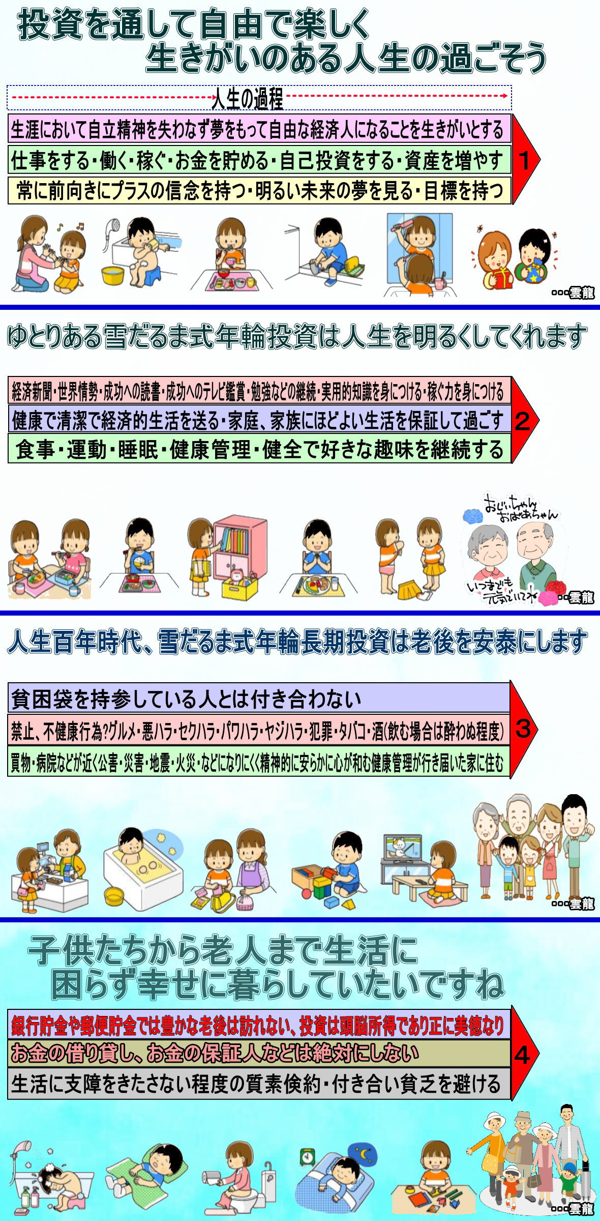 ◆文化を大切にして長期投資をしましょう 健康の維持と克己心(こっきしん・自分の欲望や邪念を制し、甘えることなく、目標を目指して邁進しようとする強い心を持つ)を大切にして文化的に人生を過ごしながら「雪だるま式年輪長期投資家」になりましょう。人生百年時代に向かって徐々に生活が豊かになっていくのが実感されるようになっていくことでしょう。