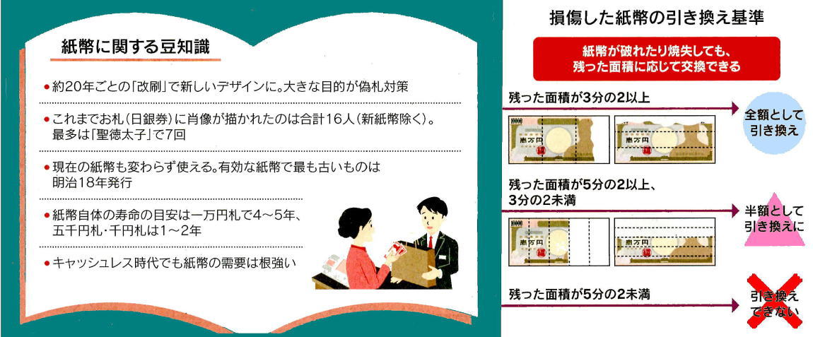 ◆新紙幣まもなく手元に 7月3日の新紙幣(日銀券)発行が手元に近づいてきた。キャッシュレス時代とはいえ、現金の出番はまだ多い。新しいものが出ると、これまでの紙幣はどうなるのか。いつまで使えるのだろう。紙幣や硬貨の素朴な疑問について調べた。 一万円札といえば、聖徳太子を思い浮かべる人もいるだろう。福沢諭吉が描かれている今のお札よりもサイズはやや大きかった。日本のキャッシュレス決済比率は2023年で4割近くにまで高まっている一方、紙幣の発行高はそれほど減っていない。その紙幣はおよそ20年の周期で切り替えられていく。「改刷」の最大の目的は偽札対策だ。デザインを一新し、簡単にはまねできないように最新の偽造防止技術が盛り込まれる。 描かれる人物も一万円札が渋沢栄一、五千円札は津田梅子、千円札は北里柴三郎にそれぞれ変わる。そうはいっても現在の福沢諭吉、樋口一葉、野口英世の描かれた紙幣が無効になるわけではない。7月3日以降もこれまでと変わらず使える。金融機関のATMや店舗・駅の券売機の新紙幣対応も進む。ただ一部で準備が間に合わない例は出てきそうだ。気がかりなのは改刷に便乗した詐欺行為だ。「古いお札は使えなくなるので交換する必要がある」 「日本銀行の担当者が回収に行く」などと促す電話がかかってくるかもしれない。 注意したい。箪笥(たんす)を探したら、もっと古い昔のお金が見つかった場合はどうか。すでに発行を終えている紙幣のうち、現在でも有効なものは18種類ある。最も古いのは1885年(明治前年)に発行開始の大黒像が描かれた一円札だ。ちなみに硬貨となると、今でも使えて最も古いのは1948年(昭和23年)発行開始の五円玉になる。現在有効な紙幣や硬貨の一覧は日銀や財務省のホームページなどに掲載されている。手元に古いお金がある人は確認してみるのもよさそうだ。 市中に流通している紙幣の平均寿命は一般的に一万円札で4〜5年程度、五千円札や千円札は使用頻度が高く傷みやすいため、1〜2年程度だとされている。手元のお金を新札に交換したい場合、銀行に持っていく方法がある。紙幣が破けたり、一部燃えたりしてしまったとさはどうなるのか。日銀の本支店に持っていって手続きすれば、紙幣の残った面積に応じて引き換えられる。いずれも表・裏両面があるのが条件。 残った面積が元の3分の2以上だった場合には額面通り全額、5分の2以上だが3分の2未満だったら半額として引き換えてくれる。ただし残った面積が5分の2未満の場合には引き換えてもらえない。ちなみに燃えてしまった場合、残った灰が紙幣であると確認できれば、その分を面積に含めて計算できる。箱などに入れ、できるだけ原形を崩さないようにして持ち込むようにしたい。引き換えに手数料はかからない。ただし確認などに時間がかかる場合がある。 日銀ではホームページや電話などを通じ、訪れる本支店への事前予約を呼びかけている。お金というと、海外旅行で使い残した外国の紙幣やコインが見つかることもあるだろう。現在流通している通貨であれば、寄付に充てるのもひとつの手だ。例えば日本ユニセフ協会(東京・港)では世界の子どもたちを支援する「ユニセフ外国コイン募金」を展開する。国内の主な国際空港(税関検査場内)などに募金箱を設置しているほか、コインについては普通郵便か宅配便でも受け付ける(送料は送り主負担)。 日本国内で使えるようにする方法もある。「ポケットチェンジ」は外国の紙幣やコインを交通系電子マネーなどに交換できるサービスだ。空港や駅の周辺、商業施設内に置かれた端末に投入すると、その時点での為替レートなどに応じて交換できる。紙幣のみの通貨もあるが、米ドルやユーロ、中国元、韓国ウォンに関してはコインにも対応している。有効活用したい。(消費経済ジャーナリストー松崎 のり子)