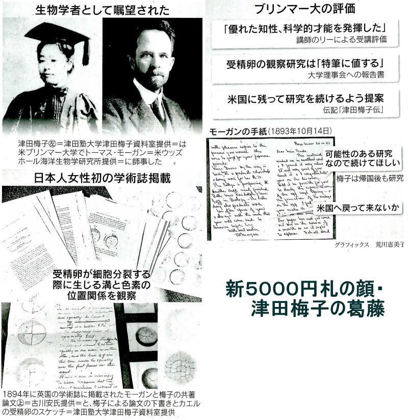 2024-06-30・・・日経より ◆選べなかった科学者への道 新5000札の顔・津田梅子の葛藤 7月3日、新しい紙幣の発行が始まる。新5千円札に肖像が使われる津田梅子は津田塾大学の前身の女子実学塾を創設し、女子高等教育の先駆者として歴史に刻まれている。実は2度目の米国留学で生物学を学び、研究者として将来を嘱望されていたことは知られていない。生物学者を選べず、教育者として生きた背景には何があったのか。1894年、英国の学術誌に梅子の論文が掲載された。米プリンマー大学で指導を受けた准教授(当時)のトーマス・モーガンと、カエルの受精卵が細胞分裂する際に生じる溝や肛門のもとになる組織と色素の位国関係を調べた。 大阪医科薬科大学の秋山康子非常勤講師は「遺伝子やDNAの存在がわかっておらず、実験手法も確立していない時代に丁寧に観察し、分析している」と感心する。当時、海外の学術誌に日本人の論文が載るのは珍しく、女性としては初めてだ。モーガンは「梅子のおかげでまとめられた」と語った。梅子の担当した部分はほぼそのまま使われた。秋山氏は「論文はこんな風に書くのだなと改めて感じさせるような文章」と話す。梅子は71年、6歳で日本初の女子留学生のひとりとして渡米した。17歳で帰国すると、英語教師として華族の子女に教えた。しかし、良妻賢母を育てる学校の方針などに不満を抱き、再留学を目指す。 女性でも学問ができるのか、試したいという思いがあった。89年、東部のプリンマー大で2度目の留学生活を始めた。最初は教育法を学ぶつもりだったが、勃興期にあった生物学と出会う。梅子は最初の留学時、高校でも数学や物理、天文が得意だった。科学史家で日本大学教授などを務めた古川安氏は「農学者の父親の影響もあった」とみる。関係資料を調べた古川氏によると、モーガンをはじめプリンマー大の教授陣は梅子の研究や学問への姿勢を激賞していた。手先が器用で分析力が高かったという。 講師だったフレデリック・リーは「非常に優れた知性と科学的才能を発揮した」と評価している。帰国前、梅子は大学に残って研究を続けるよう打診される。古川氏は「残っていれば、奨学生となり、モーガンの下で博士号も取得しただろう」と指摘する。しかし、申し出を断る。梅子の学友で、後に来日して女子実学塾を支えたアナ・ハーツホンの手記よると、プリンマー大幹部は「信じられないという反応を示し憤慨していた」という。教師を休職し、国費による留学で、我が道を行くことは難しかっただろう。女性の地位向上には高等教育が不可欠と考えていた梅子にとって、米にとどまるという選択肢はなかった。 古川氏は「梅子のモラルが許さなかった」と分析する。当時、日本では女性が科学者となる道は閉ざされていた。帰国すれば科学の道をあきらめることになる。葛藤はあったようだ。帰国後も東京帝国大学教授の箕作倍音の助言を得ながら、しばらく研究を続けている。モーガンにも状況を伝える手紙を書いた。その返信でモーガンは「米に戻ってこないか」と誘っている。モーガンはその後、コロンビア大学に移り、ショウジョウバエを使った染色体の突然変異の研究で1933年のノーベル生理学・医学賞を受賞する。弟子や孫弟子のノーベル賞受賞者は8人にのぼる。梅子の同級生らは、女性科学者の先駆けとして活躍した。 古川氏は「梅子もそれなりに大成しただろう」と話す。もうひとつの道を選んでいたら、女性科学者のパイオニアとして紙幣の顔になったかもしれない。しかし、日本社会にこれだけ影響を及ぼすことはなかっただろう。モーガンは後に、コロンビア大時代の弟子で京都大学教授の駒井卓に皮肉っぽく語っている。「梅子があれほどの名声を得られたのは、生物学と完全に縁を切ったからだ」梅子は女子実学塾での科学教育にも意欲を持っていたが、資金難で存命中は実現しなかった。それから1世紀、女子の高等教育の環境は大きく改善した。とはいえ、理工系の大学に進む女子の比率は先進国では最低だ。社会も保護者も生徒も意識を変える必要がある。梅子もそれを望んでいるだろう。(編集委員 青木慎一)