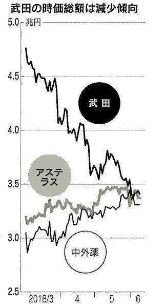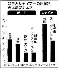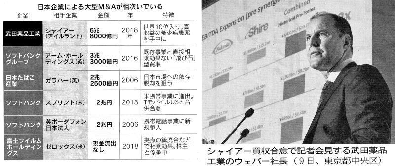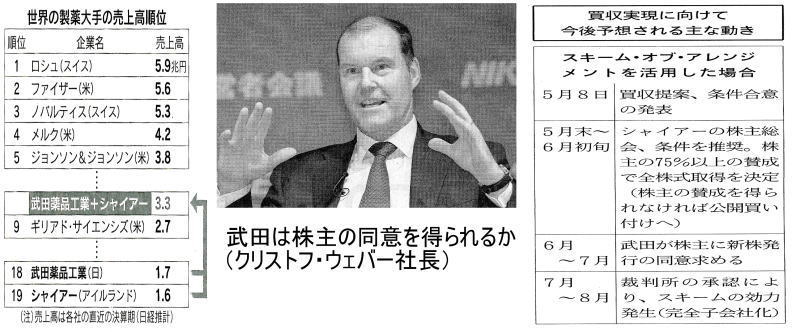 ◆武田社長「1年で成果」 開発費5000億円に拡大 武田薬品工業のクリストフ・ウェバー社長は8日、アイルランドの製薬大手シャイアーの巨忘買収合意後に日本経済新聞社の取材に応じ、「買収1年で成果を見せる。グローバルで通用㈱する強い製薬会社になる」と話した。世界最大市場の米国で製品販売を強化して足場を固め、研究開発費も増やして製薬業界の世界大手に入る決意を示した。 武田はシャイアー買収でどう変わるのか。ウェバー社長は「収益力と研究開発力で大きな利益が得られる」と即答した。研究開発費は従来の3000億円から両社合算で5000億円規模に拡大する。「癌、消化器、希少疾患などで今まで以上に強い研究開発体制を構築できる」研究開発面では合理化と効率化を進めると同時に「ワクチン、消化器、精神神経、癌という従来の重点分野に希少疾患と血液製剤という2つが加わる」と説明。 今後の武田とシャイア1が一体となった新会社は、新しく希少疾患などを加えた6領域で成長をめざす戦略も示した。希少疾患というこれまで武田の研究開発にない領域が加わったことになるが「アンメットメディカルニーズ(まだ満たされてない患者ニーズ)が高い領域。サイエンスのイノベーションも出てくる」と開発力の底上げにも自信をみせた。新株発行に対する投資家の不安に対しては「希薄化してもそれ以上の利益を約束できる。 買収1年目にはその成果をみせられるだろう」と強調した。金融機関から約3兆円を借り入れることについても「投資適格水準を維持するとともに現在の年180円の配当維持も約束する」と繰り返した。今回の買収については早期の段階からシャイアーに関心を持っていたといい「買収の検討を発表した直後から交渉を始めた」と説明。 今後、シャイアーの株主の同志を得て全株式の取得をめざす。「早ければ2019年上期には買収が完了する。3年後には買収による明確な相乗効果を確認できるだろう」と話した。異体的な相乗効果については「財務面で効率化をはかることで年間14億㌦程度のコスト効果が見込める。これは中長期的に収益に効いてくる」として、買収を株主に納得してもらうための材料の一つとしてあげた。 *旧来型の巨額買収・継続的な創薬、成否を左右 「今回の買収は戦略的な補完であって、従来のコストカットを目的としたM&A(合併・買収)とは違う」「希少疾患を加えた新しい武田は両社のノウハウで強くなれる」武田薬品工業のクリストフ・ウェバー社長は8日、失敗のリスクが高いとされる旧来型の製薬M&Aとの違いをこう強調した。製薬業界で大型買収が相次ぐなか、実績のある企業を丸ごと買うM&Aは旧来型とも古典的ともいわれる。 武田の今回の買収はこれにあたる。短期的には収益が増えるが、中長期的には人材流出などで新薬開発につながらないリスクがある。1990年から2000年代に相次ぎ、米ファイザーが典型例だ。同社は00年に約900億㌦を投じて、同業のワーナー・ランバートを統合。その後も大型M&Aを繰り返し、17年の売上高は約5兆7千億円と2000年以前の2倍超の巨大製薬となったが「時価総額の変化や新薬を見ると、買収が成功したとはいえない」(市場関係者)。約20年前、日本では新薬候補の8割以上は、製薬会社が自らうみだしていた。 だが創薬自体が難しくなり開発費が高騰する中、製薬会社は巨額の投資に及び腰になっている。この結果、現在は5割近くの新薬候補が創薬スタートアップ企業や大学との共同研究がきっかけになった。製薬大手によるここ数年のM&Aでは、優秀な研究者や有望な新薬候補を持つスタートアップ企業を対象にしている。武田は今回の買収で、短期的には製品の種類や開発品目は大幅に増える。ただ長期的にみれば、他社に負けない独自の研究開発力を備え、新薬のタネが継続的に出るような体制の構築が必要になる。 できなければ、また製薬企業を買収することの繰り返しに陥る恐れがある。シャイアーを買収すれば、研究開発費は全世界の製薬でもトップ10に入る規模となる。ただ世界で競争力のある新薬を出し続けられるかは不透明だ。 *武田格下げ方向・・・S&P 米格付け大手のS&Pグローバル・レーティングは8日、武田薬品工業の格付けを引き下げ方向の「クレジット・ウオッチ」に指定したと発表した。現在の格付けは「シングルAマイナス」。今後の財務の悪化次第で最大2段階引き下げる可能性があるとしている。 ◆武田メガ買収・投資銀陰の主役 助言役、有力日米6社が獲得 野村とゴールドマン主導 武田薬品工業によるアイルランド製薬大手シャイアーの買収は、日本のM&A(合併・買収)史を塗り替える案件になる。買収総額は7兆円弱と日本企業のM&Aで過去最大。舞台裏では案件獲得を狙う投資銀行の攻防があった。最終的に助言役に名を連ねたのは「オールスター」とも呼ぶべき日米の有力6社。欧州勢は苦杯をなめ、明暗をわけた。 グローバルな再編を繰り返してきた製薬業界。日本勢は蚊帳の外に置かれてきたが