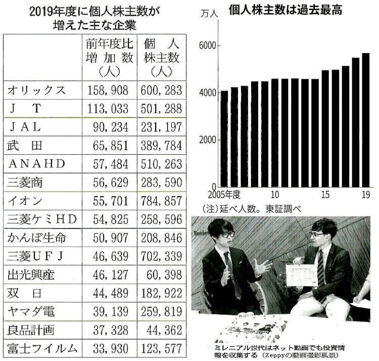 2020-07-07・・・日経より引用 ◆2019年度、個人最多5672万人 ミレニアル世代、老後備え 東京証券取引所によると、2019年度の個人株主数は延べ5672万人と過去最高だった。「老後2000万円問題」などを契機にミレニアル世代が資産運用に踏み出している。新型コロナウイルスによる急落相場で「逆張り」の買いを入れつつ、中長期的な視点で配当利回りや株主優待を手がかりにした銘柄遠別も進めている。 インターネットで投資情報を配信するZeppy(東京・千代田)は、ユーチューブ公式チャンネルの登録者数が1年で10万人を超えた。視聴者は1980年以降に生まれたミレニアル世代が多い。所得が伸びにくい「低成長」の経済しか経験していない世代だけに、副収入につながる投資への潜在的な関心はある。東証によると、個人株主数は前年度に比べて延べ199万人増えた。老後2000万円問題が騒がれた昨年、QUICK資産運用研究所の調査で「資産形成の必要性を感じる」という人の割合が初めて5割を超えた。日経マネー調査では20年に入って投資家デビューした人の6割近くが40歳未満だった。テレワークの広がりもミレニアル投資家を勢いづかせた。6月第4週の現物株売買で個人投資家の比率は26%まで高まった。 外国人投資家が少ないクリスマス時期を除くと異例の高さだ。ミレニアル世代を含む個人マネーはどんな銘柄を買っているのか。有価証券報告書などに記載される個人株主数の変化をみると、まず相場の大底を狙って買い向かう「逆張り」の傾向がうかがえる。コロナ・ショック相場で上場来安値を付けた日本航空は20年3月期に個人株主が9万人余り増え、約23万人になった。増加数は前の期の4・4倍だ。株価が6年ぶり安値まで下げたANAホールディングスも、個人株主の増加数が前の期の6・2倍の約5万7000人に達した。コロナ後の航空需要の回復とともに株価も反発局面に入ると読み、悲観ムードが強いうちに航空運賃が割引される株主優待の権利も得ておこうという心理も働いた。預金金利がほぼゼロになる中で、配当利回りや株主優待への関心が強まっている。 個人株主数が15万人以上も増えたオリックスは19年3月期まで10期連続で増配した。今期の配当予想は未定だが、仮に前期並みなら利回りは6%近い。各地の食品などが選べるカタログギフトの優待もある。1Tも個人株主が11万人余り増えた。「ESG(環境・社会・企業統治)」を重視する機関投資家はたばこ会社への投資に慎重だが、8%近い予想配当利回りが個人を引き寄せている。ミレニアル世代の運用資産は平均すると数十万円にとどまり、株価水準が高い銘柄は関心があっても予算オーバーで手がけにくい。最近、投資を始めると決めた東京都の30代男性は「1人10万円の定額給付金がきっかけ」という。・思い切った株式分割によって人気銘柄になったのが良品計画だ。株価が2万円前後だった昨年9月に1株を10株に分割し、約20万円から投資できるようにした。 「MUlI」ファンの買いも入り、20年2月期末の個人株主数は4万4362人と1年前の6・3倍に増えている。一万、2018年12月に新規上場したソフトバンクは20年3月期末の個人株主数が69万2140人と、1年間で約11万8000人減った。公開価格1500円を上回る場面では売りが出やすい。auカブコム証券の小松圭一営業部長は「個人投資家の『旋風』は当面続きそうだ」とみている。ただし、3月中旬以降の戻り相場で入ってきた短期売買の個人は定着するかどうか不透明だ。新興市場の一部銘柄への期待が過熱すると、多くの個人投資家が退場を迫られた2006年の「ライブドア・ショック」の再来につながりかねない。 東京証券取引所の調査や日経会社情報デジタルなどのデータから、企業とともに変貌する株主のいまを読み解く。