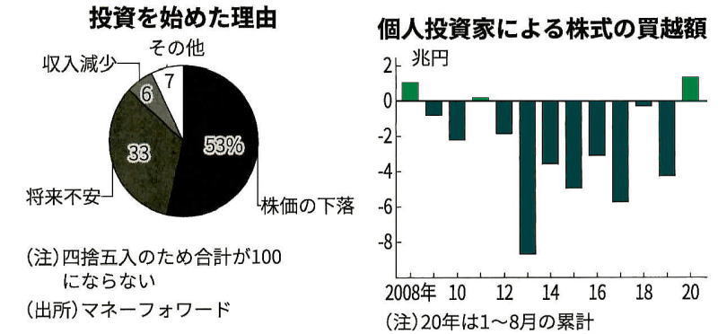 2020-10-01・・・日経より引用 ◆在宅勤務デイトレ好機、投資デビユー、給付金活用も ベテランはリスク分散 新型コロナウイルスまん延は個人投資家に「新常態」をもたらした。在宅勤務でデイトレードを始めたり、コロナ級の有事に備えてポートフォリオの分散を図ったり、ウィズコロナの投資スタイルが広がっている。隣のインベスタト第5部では、コロナ相場でむしろ勢いづいた個人マネーの実相をさぐる。 滋賀県の会社員、田中誠さん(仮名、盟は4月以降、好みの株式情報アプリで選んだ有望銘柄を午前9時の寄り付きで買い、すかさず売り抜けるデイトレードを手がけている。コロナ感染防止で週の半分が在宅勤務になり、相場に向き合えるようになった。リアルタイム株価をにらみつつ15分ほどの超短期で手じまうのが田中さんの基本スタイルだが、後場まで持ち越すこともしばしばだ。「在宅勤務なら仕事をしながらいつでも値動きをチェックできる」。最近では「出社の日もスマホでこっそり取引している」という。 コロナの特別定額給付金10万円も投資家の裾野を広げた。上京したばかりの大学1年生、松岡海都さん(19)は関心のあった米国株の上場投資信託(ETF)に全額つぎ込んだ。「遊びに行くところもないので」と料理宅配「ウーバーイーツ」でのアルバイトに精を出し、買い増しのタイミングをうかがう。一方、ベテランの個人投資家はどう動いたか。ひとつの傾向として世界規模の有事のリスク回避などを狙ったポートフォリオの分散がある。コロナショック以降、まとまった資金がコモディティー(商品)投資に向かった。 「マイナス価格はさすがに異常値。航空機が飛ぶようになれば必ず需要が戻ってくる」。保険会社勤務の梅野勇輝さん(仮名、32)は米原油先物価格が史上初のマイナスになったのをみて原油価格に連動するETFを買い、下げ局面でさらに買い増しした。「有事の金」に傾斜した投資家も多い。東京都の高橋麻衣さん(同、30代)は7月下旬から週1万円ずつ金現物の積立投資をしている。 「株価は回復したけれど、『二番底』があるかもしれない」と考えた。金価格は初めて1トロイオンス2000㌦を突破して最高値圏にあるが、高橋さんは「それは承知のうえ。有事があれば金がまた買われる」とみる。コモディティーを交えた分散投資が進むとともに、多くの個人のポートフォリオの中心である株式ではウィズコロナの銘柄選別が浸透してきた。日経平均株価やダウ工業株30種平均は急落前の水準に戻したが、個別銘柄の株価は明暗を分ける。この半年で個人が身につけたウィズコロナの投資スタイルは、相場形成メカニズムにも影響を及ぼしている。 *10人にl人コロナ機に 新型コロナウイルスまん延は、個人が投資に踏み出すきっかけになった。5月中旬にマネーフォワードが同社の家計簿アプリ利用者のうち投資未経験者を対象に調査したところ、10人に1人がコロナ下で「投資デビュー」を果たしていた。投資を始めた理由は「株価が下落したため」が53%で最多だった。パニック売りが一巡した後の株式相場の急反発を好機とみたようだ。「将来が不安なため」との回答も33%にのぼった。 東京都のITコンサルタント、大山遥人さん(同、32)は「会社がずっと潰れないとは限らない」との危機感からまず「配当金を家賃に充てたい」と1Tなど高配当株を買い、新興株のデイトレードまで手を広げた。インターネット証券5社では相場が急落した3月からの6カ月間で127万口座が新たに開設された。2019年下半期に比べて5割増のペースだ。コロナが動かした個人マネーが相場に与える影響は小さくない。東京証券取引所によると、2020年に入って個人投資家の株式の買越額は8月末までに1兆2000億円に達した。年間の買越額はリーマン・ショック当時の2008年を上回る可能性がある。