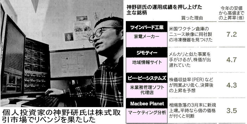 2020-12-24・・・日経より引用 ◆コロナ相場で返り咲く、個人資産ゼロから1億円 乱高下動じず下値買い 下値で買うと、株価は5月に入って面白いように上がり、利益は約600万円になった。これを皮切りに2020年、資産ほぼゼロから1億円を稼ぐとは本人も想像していなかった。11月には東証2部のツインバード工業で約3500万円の利益を積み上げた。米国のワクチン物流倉庫のニュース映像で同社の冷凍設備を見つけたのがきっかけだった。日経平均株価はコロナショックから29年ぶり高値まで跳ね上がった。成功をつかんだ個人投資家は少なくないが、神野には格別の思いがある。かって撤退を余儀なくされた株式市場でリベンジを果たしたからだ。株式投資を始めたのは2012年。アベノミクス相場で稼いでいた有名投資家、ハンドルネーム「テスタ」に触発され「スキャルビング」という投資手法を上達させた。 リアルタイムの売買注文が表示される「板」で株価が動く予兆をとらえて注文を出し、数秒後に反対売買するトレードだ。しかし、スキャルビングで月100万円を稼げるようになっていた2015年、突如として勝てなくなった。板の動きがあまりに速く、手の内を読まれているようで売買タイミングを逸してしまう。一発逆転を狙って信用取引で買い建てた新興株が急落し、コツコツとためた3000万円のうち2000万円を一気に失った。そのまま株式市場から身を引いた。個人投資家のスキャルビングを追い詰めたのは、コンピューターで瞬時に膨大な注文を出す高速取引業者(HFT)だ。東証は10年に稼働させた高速取引システム「アローヘッド」の処理能力を2015年に増強。高速取引が売買注文の約7割を占めるほどになっていった。 相場への思いをひきずっていた神野は企業決算などの「ファンダメンタルズ分析」で成功したトレーダーに教えを請い、2019年11月にカムバックした。「株で1千万円勝っても、1億円勝っても、現金にして確定させなければ含み益のまま。ゼロになるかもしれない」。神野は今、スキャルビング時代に知人の紹介で初めて会った憧れのテスタの言葉をかみしめる。ITバブル、小泉相場、アベノミクス、そしてコロナ相場1・・・・・相場の熱狂は多くの個人トレーダーに成功をもたらしたが、ほとんどは夢破れて去っていった。神野はいう。「今年は勝てたが、来年どうなるかば全く分からない。相場にあわせて自分も変わらなければならない」 (敬称略)
