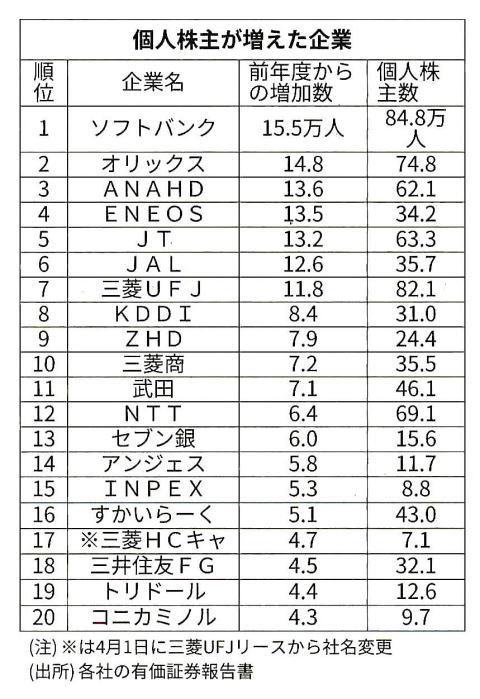 2021-07-16・・・日経より引用 ◆株主レーダー2021、個人、最多の5981万人 若年層の口座45%増、ネットで訴求/知名度生かす 東京証券取引所の株式分布調査によると、2020年度の個人株主数は延べ5981万人と前年度比300万人造増え最多となった。個別企業では、新型コロナウイルス禍でリアルの接点がない申、インターネットを通じて魅力を訴えたことによる株主数増加が目立つ。知名度がある企業が新規参入の投資家を取り込んだことも大きい。「新たなチャネルを通じてアプローチする取り組みに力を入れた」。三菱商事は2020年度の個人株主数が約35万6000人となり、前年度比で25%増えた。コロナ下で対面の説明会を開くのが難しい中、ネット証券などの顧客接点を活用してオンライン説明会を開催し、個人投資家に訴えたことが奏功(そうこう)した。 日本の個人投資家は相場の大底を狙って買い向かう「逆張り」が持ち味だ。ENEOSホールディングスは脱炭素の逆風でエネルギー関連企業全般の株価が低迷する中でも個人株主数が13万人あまり増えた。厳しい事業環境でもコロナ収束を見越して上昇余地がある航空や外食業界でも株主が増える傾向が強い。足元の回復は鈍いが、今後はワクチン接種が広がり、人の往来や消費が増える可能性が高まると見ている。航空では日本航空の株主数が5割以上増え、ANAホールディングスも28%増の約62万1000人になった。外食ではすかいらーくホールディングスやトリドールホールディングスも急増した。 知名度のある企業も高い伸び率となった。ソフトバンクは約84万8000人と23%増えた。2018年12月の上場後株価がさえず、2019年度は公開価格(1500円)を上回ったところで売りがかさみ、大幅に株主数が減っていた。通信関連ではKDDIなども伸びが大きい。けん引役はミレニアル世代に代表される若年層だ。日本証券業協会の集計では、30歳未満のインターネット取引口座数は2020年度の1年間で45%増えた。「コロナ禍での株価下落からの急上昇で、株式投資に今まで踏み出せなかった層にも関心が広がっている」 (ネット証券)という。