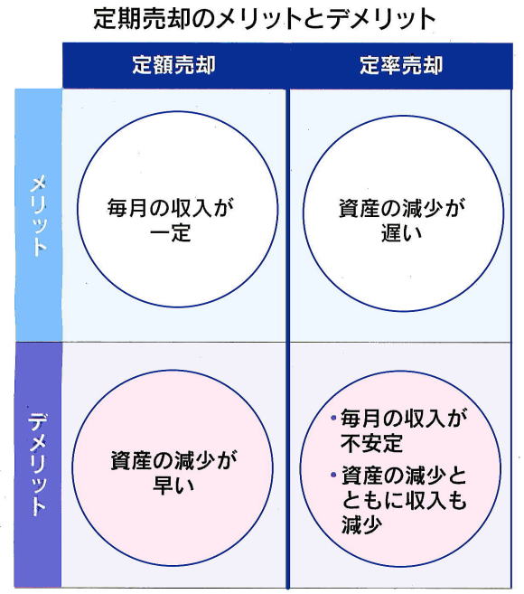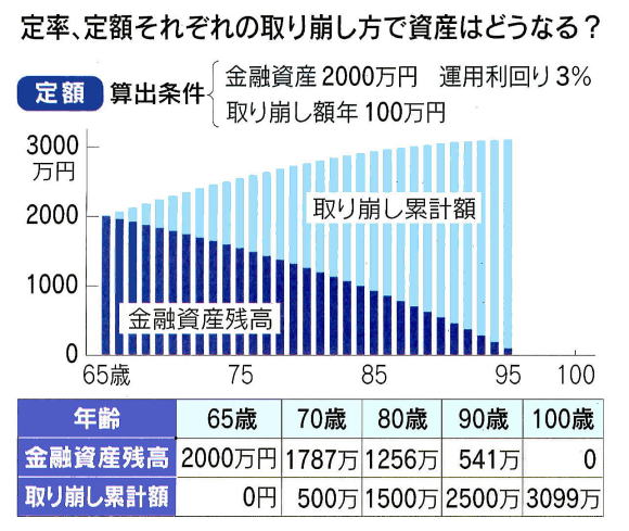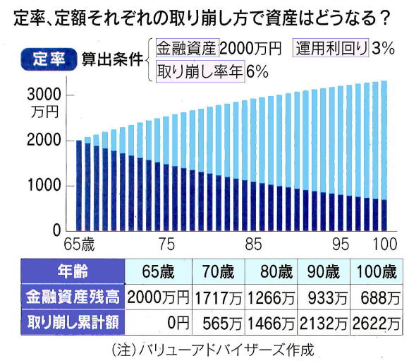 2024-02-29・・・日経より ◆引退後、資産どう取り崩す? リタイア後は一般的に公的年金だけでは生活費をまかなうことができず、運用してきた資産などの取り崩しが必要になってくる人も多い。運用すること自体も大事だが、同時に取り崩し方法を考えることも大切になってくる世代だ。人生100年時代。引退後の人生が30年以上続くことを考えると、資産寿命を延ばすためにできるだけ長く運用を続けながら、必要に応じて取り崩すのがよさそうだ。 *「定率」か「定額」か組み合わせ リタイア後も資産運用を続けながら、必要に応じて分割で取り崩していくことで資産寿命を延ばすことが期待できる「分割取り崩し」。例えば、2000万円の預金を65歳から毎月約8万円ずつ取り崩す場合、資金は86歳で尽きてしまう。そこで、2000万円を年率3%で運用しながら毎月約8万円ずつ取り崩せば、98歳まで資産寿命を延ばすことができるようになる。分割取り崩しには2パターンある。 一つ目はマーケットベース売却。市場の状況を見ながら相場の上昇時に利益を確定して現金化する。一見、良さそうに思えるが、簡単ではない。適切なタイミングでの売却は非常に難易度が高く、逃すと大きく下落したときに生活資金が必要となり、さらに大きな金額を売らなければならない可能性がある。運用効率も悪くなるおそれがあり、常に市場を見なければならない心理的負担も大きい。2つ目は定期売却だ。価格変動やタイミングを考えず、定期的に売却するため心理的負担も少なく、大きく下落したときに大きな金額を売却するリスクも減らせる。 証券会社や銀行が定期売却サービスを手掛けている場合、手間もかからない。定期売却にも定率、定額の大きく2種類がある。定額売却は毎月の収入が一定になるので資金計画が立てやすい。ただ、資産が減っても定額で売却するため、資産の減少スピードが加速し、その減り方は定率よりも早い。定率売却は資産寿命が最も長くなるが、相場次第で取り崩し額が変動するので毎月の収入が安定しない。長年取り崩すことで資産が減少するとともに受取金額も減る。 例えば、資産2000万円のときに6%で取り崩した場合は年間120万円受け取れるが、資産1000万円のときに6%で取り崩すと年間60万円しか受け取れなくなる。どの方法を採用するのか最も良いかは、その人の状況によって異なる。例えば、リタイア後の資金計画に余裕があり、資産を長持ちさせることを優先したい場合は定率の取り崩しが良いだろう。受取金額が減ることに備えて手元に現金を置いておくことで、生活費に補填することができる。 資産の減少とともに受取金額が減る場合、比率を上げることで受取金額老増やせる。受取金額が多いときには使い過ぎず、ためておくことで対応できる。一方、生活費の不足分を埋めるため、毎月一定の収入が必要ならば定額を選ばざるをえない。そして、これらの方法を組み合わせることもできる。例えば、資産の多い老後の前半は定率で受け取り、資産が減少したら定額に切り替える方法だ。 逆に当初は定額で、年齢を重ねて支出が減ってきたら定率に切り替え、受取額に合わせて生活を切り詰めていく考え方もある。資産運用は理想の人生を生きるための手段だ。入り口の商品選択ばかりを考えるのではなく、築いてきた資産をどのように活用するかの「出口戦略」もぜひ、考えてほしい。(ファイナンシャルプランナー五十嵐 修平)