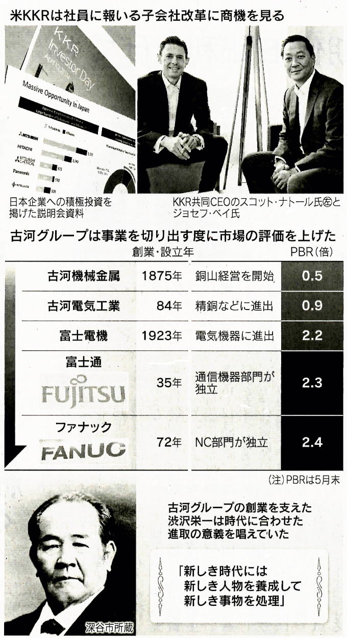 2024-06-29・・・日経より ◆子会社は誰のものか・・・梶原誠筆 子会社は親会社のお荷物ではなく、成長の源泉だ。日本の株式相場がもたついている。株高をけん引してきた外国人投資家は、先週にかけて5週連続で売り越しだ。だが悲観することはない。かつてないほど日本に強気な海外投資家もいる。「日本には巨大なチャンスがある」。米大手投資会社KKRは、4月に開いた投資家向け説明会でこう訴えた。言及した回数は香港や韓国の6回、シンガポールの4回に対し、日本は40回に及ぶ。説明会では日本株式会社の縮図といえるスライドを掲げた。 三菱商事、日立製作所、三菱ケミカルグループ、パナソニックホールディングス、三井物産…:。数百以上の子会社を持つ会社が並ぶ。その横に円グラフがある。東京証券取引所なども課題としているPBR(株価純資産倍率)の向上だが、1倍割れが上場主要企業の約40%に及ぶとの内容だ。株価が安く放置されているのは子会社をうまく経営できていないからだ。ならば我々が買い取って立て直してみせよう。こんなこんな意志浮き上がる。 日本企業のM&A(合併・買収)は常に、買収の件数が売却を上回ってきた。調査会社レコフデータによると、1985年以来例外は一度もない。2023年は上場企業による買収が796件だったのに対し、売却は363件と半分以下だった。売りをためらった結果、新陳代謝が遅れて収益性の低い子会社が蓄積していった。KKRは子会社をどう立て画すのか。カギは「社員」だ。筆者は最近、このスライドをもとに共同最高経営責任者(CEO)のジョセフ・ベイ、スコット・ナトールの両氏と議論した。ベイ氏はいう。 「子会社は実質的には親会社の株主のものだが、子会社の社員のものでもある」企業の担い手は社員だ。社員にやる気を出してもらわないと企業価値は高まらない。同社は4月、昨年買収した医薬品製造受託(CMO)大手の武州製薬(埼玉県川越市)で1330人の全社員に疑似的な自社株を付与した。ファンドが主導する形としては日本で初めての制度とされ、企業価値を高めるほど社員は豊かになる。計画通りに成長すれば、KKRの売却時に社員は給与6カ月分の報酬を手にする。「成功の分かち合い」。ベイ氏が強調するしくみは今後、KKRが買収する子会社に導入する。1976年に創業したKKRは買収ファンドの老舗だ。資本主義の一つの形態を米国で創った。買収した企業に経営者や資金を投入して価値を高める。 するとファンドに資金運用を任せる公的年金基金の、教師から消防隊員に至る市井の受給者の生活が安定する。だが、死角があった。買収した企業の幹部には株を付与して動機づけをしたが、社員は置き去りだったのだ。所得の格差は広がり、リーマン危機や新型コロナ禍で職を失った人々を中心に資本主義への不信が噴出した。「米欧の多くの企業では、社員が取り残されて自ら創造した価値の分け前を得られなかった」ナトール氏は振り返る。もう落とし穴に陥るわけにはいかない。 社員全員が同じ船に乗る、修正版のファンド革命が日本で始まった。2人に言われるまでもなく、子会社は社員のものだ。これまでは親会社の都合に振り回されてきた。天下り先や修行の場にされ、リターンが低いので成長投資もしてもらえない。それが株価低迷という形で親会社に跳ね返っている。今こそ子会社の再定義が必要だ。「アニマルスピリッツを燃やす社員が親会社の枠を飛び出し、とがったことに挑む成長の場」としてはどうか。 古河グループの150年に及ぶ歴史はこの仮説を裏付ける。華業家の古河市兵衛が銅山経営を始めたのが1875年。母体である古河機械金属の創業だ。84年に精鋼などに乗り出し、古河電気工業が創業した。192年には古河電工がドイツのシーメンスと合弁で電気機器製造の富士電気を設立した。35年に富士電気機の通信機器部門が独立して富士通が生まれ、72年に富士通の数値制御(NC)部門が独立してファナックが生まれた。 成長を追い求めた結果、子、孫、ひ孫、やしゃごになるにつれてPBRが高まっているのは偶然ではない。株式市場が評価すれば、成長資金も有刺に開運できる。だが、死角があった。買収した企業の幹部には株を付与して動機づけをしたが、社員は置き去りだったのだ。所得の格差は広がり、リーマン危機や新型コロナ禍で職を失った人々を中心に資本主義への不信が噴出した。 来週、1万円札の顔が渋沢栄一に変わる。古河市兵衛を支え、グループ創業の立役者になった日本資本主義の父だ。こんな名言も残している。「新しき時代には新しき人物を養成して、薪しき事物を処理せねばならない」「人物」を「会社」に置き換えてみてほしい。渋沢が関わっても、カネボウのように時代に適応できず後に経営が行き詰まった会社は多い。形を変えて成長する古河グループに、東京・谷中の基で渋沢は相好を崩しているだろう。 KKRの両トップが口をそろえて繰り返した二番がある。株式市場を意識した日本企業の経営改革は「始まったば
