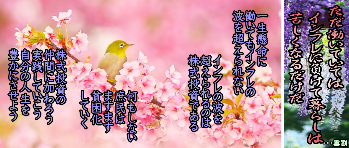 | ・・・雲劉 ◆長期株式投資をするには *社畜人は仕事を楽しく長く勤めること *日頃から質素倹約しつつ貯めること *借金をしないこと、お金を貸さないこと、 保証人をしないこと、付き合い貧乏はしないこと *株投資への信念を持つこと *投資と仲良くなること *株投資を人生をかけて楽しむこと *自分で思考して自己責任で投資をする *リスク許容度異常に投資はしないこと *株を保有したらほったらかしておく *時には投資を忘れていること *含み損に耐えること *含み益を確定しないこと *ゆっくりと小金持ちになること *SNSなどの意見に惑わされないこと *善き伴侶を持つこと *・・・・・ ◆善き伴侶とは *顔と年齢で妻を選ばない *顔やスタイルだけで選んではいけない 顔や年齢やスタイルは必ず劣化します *正直で知的で思いやりがある女性 性格や姿勢や思いやりは劣化しないです *顔が可愛いくとも内面の悪い女性は避けること *知性は自分と同じ程度の女性 *男を言いなりにしない女性 男をたててくれる女性 *借金をしていない借金をしない女性 与えられたお金の範囲内で暮らせる女性 *生活費の管理ができる女性 男のお金・資産に口を挟まない女性 *男を管理しない女性 *5S・質素倹約・炊事・洗濯・セックスを受け入れる女性 家庭家族を守っていける女性 *株投資に理解をしめす女性 *もろもろ・・・・・ ◆ただ働いていてはインフレに負けて暮らしは苦しくなるだけだ