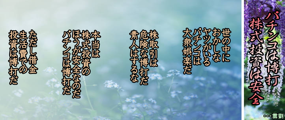 24-・・・雲劉 ◆株式投資は怖くはありません 怖いのは無意味な無駄な借金です A「株式投資をしませんか」 U「損するんじゃないですか」 「財産なくすんじゃないですか」 「楽して金儲けするものはどくな奴がいない」 A「余剰金で現金取引するなら比較的安全です」 「信用取引している人は暴落したときなどに追加証拠金(追証)が払えなくなり損するのです」 A「あなたは、クレジットカード使用で限度額越えたことがありませんか」 「少額ならありますけれど、直ぐに返せますから」 A「自動車などはローンで買っていませんか」 B「マイカーローンは誰でもしていることだし、そんなに困ることもありません」 「マイホームも35ローンを支払っています、毎月きちんと支払っていますから大丈夫です」 A「多額の借金(ローン)は平気で株式投資は怖いのですか」 「私に言わせれば、借金の方が数十倍怖さを感じます」 「35年ローン、気の遠くなるほど多額の借金には鳥肌がたちますね」 A「パチンコを借金でしている人もいます」 「負ければ、更にお金を借りてパチンコをしている」 「怖さ知らずというか、借金の怖さを通り越しています」 「こんな怖い旦那がパチンコに良くとき、快く送っている妻も見受けます」 「このような妻でも株式投資をすると言えば、損するから辞めなさいと説教するのです」 「世間の投資経済の仕組みが全然理解していないのです」 一番怖いのは、パチンコ間隔で株式投資等を始める人です。株式投資を博打と勘違い(かんちがい)して株式の売買している人です。こういった人は必ず大損して株式相場から撤退していくのです。このような人は、特別な大金が入ると大儲けしようと博打感覚で始めたがるものです。株式は博打ではありません。肝に命じておきましょう。 ◆パチンコは博打 株式投資は安全