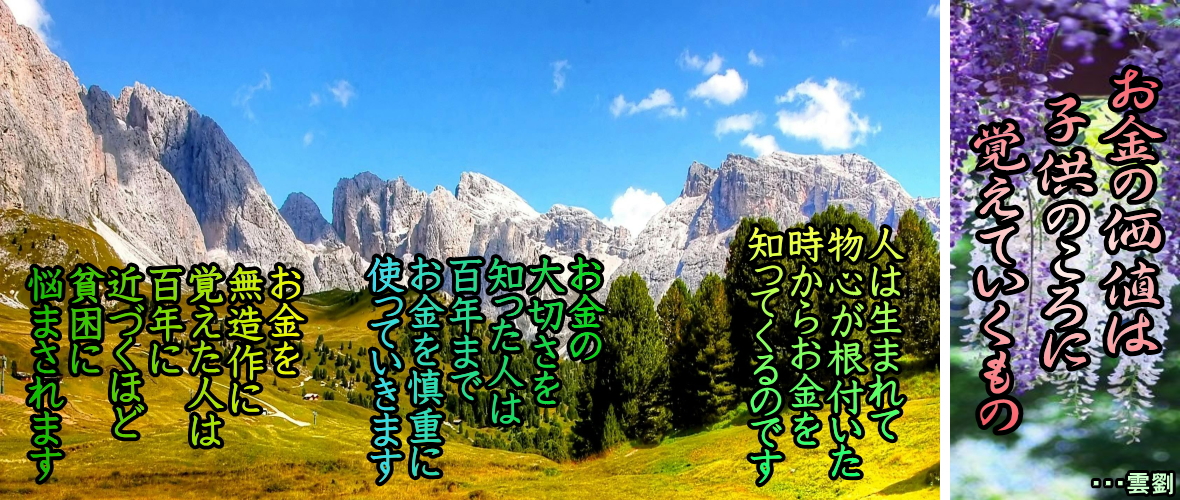 ・・・・・・・・・・・・・・・・・・・・・・・・・・・・・・・・・・・・・・・・・・・・・・・・・・・・・・・・・・・ *バーナード・ショウ 我々は恥辱(ちじょく)の世界に住んでいる われわれは真実に存在する あらゆるものに恥をかかされる ・・・・・・・・・・・・・・・・・・・・・・・・・・・・・・・・・・・・・・・・・・・・・・・・・・・・・・・・・・・ ◆お金の価値は子供のころに覚えていくもの