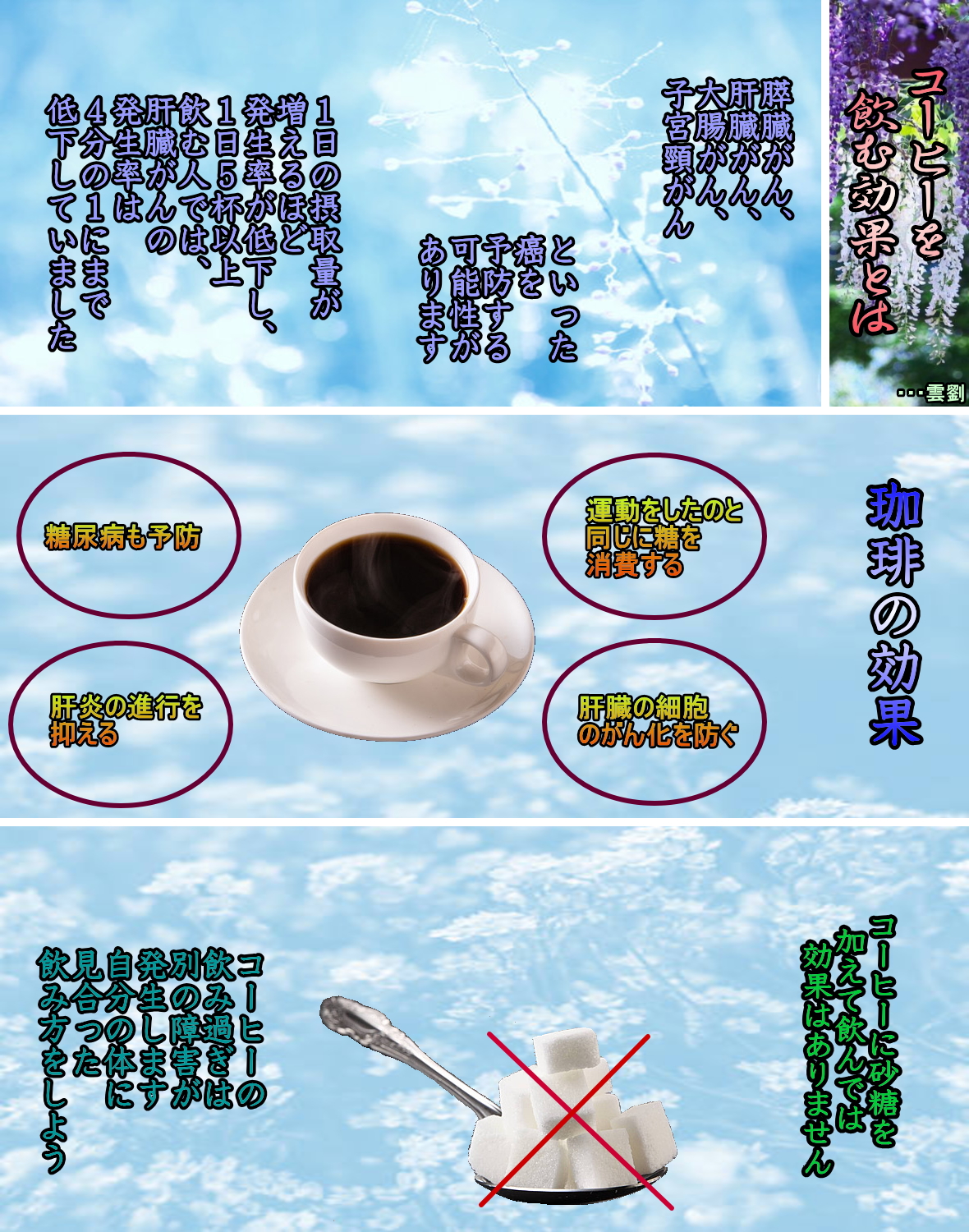 *見た目変化なくても用心 日にちがたったペットボトル飲料の見た目やにおいはどう変わるのか。記者は自宅で実験を試みた。ミネラルウオーター、緑茶、コーヒー飲料をひとくち飲み、蓋を閉めて常温で放置。朝と晩、においや見た目を観察した。1週間後、驚いたことにいずれにも目立つ変化はなかった。 コーヒー飲料はコーヒーの香りが強く、変化がわかりづらい。見た目も白い牛乳の成分が少し分離したくらい。衛生微生物研究センターの李さんに聞いた。「1㍉リットルあたりの菌が1000万個を超えると、においが変わったり飲料が濁ったりするなど変化が表れるが、それより少ないと見分けるのは困難」。日ごろ、いつ口をつけたか忘れがち。「まあいいか」で済ませてはいけない。(若山友佳) 2017-06-14・・・日経より引用 ●カフェイン中毒搬送100人 2011~15年度眠気防止薬など 多用一日、マグカップの コーヒー3杯分以上は飲まない カフェインを多量に含む眠気防止薬や「エナジードリンク」などの清涼飲料水の急性中毒で、2011年度からの5年間に少なくとも101人が救急搬送され、7人が心停止となり、うち3人が死亡したことが13日、日本中毒学会の調査で分かった。 15年に死亡例が判明したことなどを背景とした初の全国調査。カフェインは、一度に1g以上を摂取すると中毒症状が出るとされ、激しい吐き気やめまいが起き、心拍数が上がる。 心停止に至った7人はいずれも6g以上取っており、中には53gを摂取したケースもある。自殺目的の場合もあったが、看護師などの深夜勤務の人が服用する例も多かった。 調査は、全国の救急医療機関38施設を対象に、2011~15年度に救急搬送されカフェイン中毒と判明した人を集計。患者は2013年度から急増しており、97人は眠気防止薬を服用、コーヒーやエナジードリンクをあわせて飲んだ人もいた。エナジードリンクだけの中毒は4人だった。 調査した上條吉人・埼玉医大教授は「カフェイン中毒の危険性が一般の人には十分知られておらず、行政も実態を把握できていない。一度に購入できる眠気防止薬の量を制限すべきだ」と話している。カフェインの摂取許容量は定められていないが、海外での目安は成人で1日当たり0・4g(マグカップのコーヒー3杯分)程度。 エナジードリンクは数本を一気に飲まない限り問題ないとされる。15年には、九州地方の20代男性がエナジードリンクと眠気防止薬を長期間飲み続け、死亡した例が報告されている。 ◆珈琲を飲む効果とは