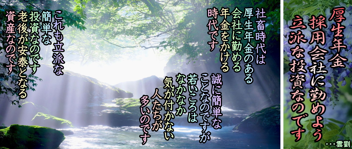 24-・・・雲劉 ◆人間としての欲望の為に豊かな家族の人生の為に正しく「お金・資産」を増やそう 人間に欲望が失われたら、もはや抜け殻のようなものです。その欲望とは第一には食欲です。毎日食べて行かなければなりません。次には住居あっての睡眠欲と生活欲と健康欲です。健全な健康なくして素晴らしい人生は成り立ちません。その次には食に住居に生活を支えるものは「勉強」と「お金」なのです。この二つが一つとなり自分の友となって二人三脚で日々を過ごしていくのです。 生活の為に「お金・資産」を増やすには、ごく普通の人達は一般的には勤めることでしょう。一生懸命に働き給料を頂き、そのお金で生活をしていくのです。ごく普通の生活をしていくなら定年まで社畜一本でも普通の生活なら充分なはずです。年金生活でも質素(お金のかかる無駄なもの=見栄・ブランド欲・グルメ・贅沢)な暮らしさえ出来るのであれば人生を閉じるまでなんとかなるものです。現在の世の中では、社畜中に、会社の景気が傾いたりしてリストラに遭うかもしれません。 給料が減給になるかもしれません。40~50代に早期退職(リストラ)しても次の仕事先は日雇い派遣などの必要な時に働いてもらうような仕事しかないのが現状です。結婚していて家族もいるなら、尚更悲惨な生活に追われてしまいます。ですから20代の若い頃から真面目に社畜しながら、もう一つの仕事を持たなければ未来が危うくなるのが必然的なのです。そのためには「投資」というものに金銭的な欲望を振り向けるのです。社畜しながら出来る唯一の方法なのです。 その金銭的な欲望を邪魔するものを排除する必要があるのです。それは、「ギャンブル・パチンコ・競馬・競輪・賭け事」に「グルメ・ブランド品・旅行・宝くじ・パチンコ・麻雀・豪華な住居・豪華なアイテム」などの贅沢品の購入や浪費などです。家族の1人でも浪費者がいると金銭的な欲望の芽が折られてしまいます。家族一丸となって質素倹約に協力して「投資欲」盛り立てて行かなければなりません。 家族全員で投資経済を勉強して質素倹約して貯めて行けば余剰金が貯まっていくものです。その余剰金を「投資」に振り向けましょう。私の進める「投資」は「雪だるま式長期株式投資」なのです。質素倹約し余剰金を毎月積み立て「投資」に振り向けましょう。将来には貧困から逃れて小金持ちへとなっていることでしょう。そのためには必ずなるべく若い時から投資をすることです。みなさん頑張りましょうね(#^.^#)。 ・・・・・・・・・・・・・・・・・・・・・・・・・・・・・・・・・・・・・・・・・・・・・・・・・・・・・・・・・・・ *家族全員で、投資経済の勉強をしましょう *家族全員で、お金を遊ばせないようにしましょう *家族全員で、お金の価値観を共有しましょう *家族全員で、お金の知能指数を高めましょう *家族全員で、質素倹約に努めましょう *家族全員で、健康管理を怠らないようにしよう *家族全員で、品格のある人になりましょう ・・・・・・・・・・・・・・・・・・・・・・・・・・・・・・・・・・・・・・・・・・・・・・・・・・・・・・・・・・・ *見栄は貧乏の始まりです *人を貶す行為は貧困の現れなのです *「あいつはケチだから」「あいつはガメツイから」 そう言う人は「お金の知能指数」が低い証拠なのです 羨ましいのです 哀れな行為なのです ◆厚生年金採用会社に勤めよう 立派な投資なのです