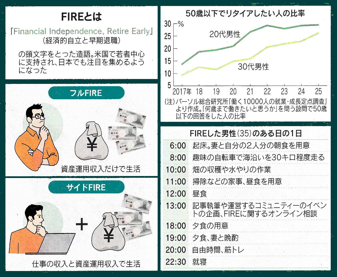 25-**-** ◆3、FIRE&フリーランスについて 2025-11-01・・・日経より ◆FIRE達成者資産額は? 目安は年間支出の25倍、リスクも 働かなくても生活できる資産をつくり、早期リタイアを果たす「FIRE」。若年層を中心に夢見る人も多いが、リスクも伴う。どれくらいの資産が必要で、実現した人はどのように暮らしているのだろうか。 「仕事に時間を奪われて生活がおろそかになっている。帰宅後は自炊や掃除をする体力もない」。中国地方に住む地方公務員の男性( 26)はそんな生活に疑間を感じ、40代までのFIREを目指す。自分の仕事が政策につながっていると実感できず、上司を見ても将来の仕事に魅力を見いだせない。 食費の節約や少額投資非課税制度(NISA) の活用などで保有資産は1000万円を超えた。FIRE への道のりは「まだまだ」だが地道に準備を続ける。FIREは米国でミレニアル世代(1980年から90年半ば生まれ)を中心に支持され、日本でも注目を集めるようになった。資産運用で生活する「フルFIRE」や一定の収入を得ながら運用益を活用する「サイドFIRE」などがある。 「人生100年時代」といわれ、定年を延長する企業も多い一方、早期退職を望む働き手も多い。パーソル総合研究所が2025年に実施した調査によると、退職希望年齢を「50歳以下」と答えた割合は20代男性が29・4% 、30代男性が26・・%。2017年の調査と比べるといずれも2倍以上になった。女性は20代が30%台、30代は16~20% 強で推移し、ほぼ変化はない。 若年男性の意識の変化について同研究所は、共働き世帯の増加で男性だけが家計を支える状況が減ったことや、未婚率の上昇も背景にあると分析する。退職して不安なくFI RE生活に入るためには、死ぬまで生活を支えられるだけの資産が必要になる。目安として有名なのが、米国発祥の「4%ルール」。年間生活費の25倍の資産を用意し、年4% で運用すれば、必要額を毎年取り崩しても資産が尽きないという理論だ。 例えば支出が年400万円なら1億円の計算になる。実際にFIREした人たちはどれくらいの資産を準備し、どのように暮らしているのだろうか。二重県の男性(35)は、今年1月に保有資産約7500万円で不動産関連会社を退職し、自営業の要と暮らす。入社後3年で上司のパワーハラスメントをきっかけに3カ月休職。「お金がないと辞めることもできない」と、本格的に日本の個別株やインデックス投資などで資産形成を始めた。 祖母が生前暮らしていた築60年の家に住み家賃を浮かせ、固定費も削減した。現在は畑仕事をしたり、趣味の自転車で30km程度走ったりと快適に過ごす。FIREに関して相談し合える仲間をつくるため、6月にはオンラインコミュニティーをつくった。記事執筆等で月数万~10万円程度の収入も得ている。将来市況が悪化すれば保有資産が目減りするのではとの不安もあるが、その時は「野菜を育てたリシジミをとりに行ったり、今の自給自足の生活が生きてくる」と話す。 東京都内の貿易系会社に勤務していた女性( 36)は保有資産8000万円で22年末に退職。夫も仕事を辞め、10歳、7歳の子と2023年12月からタイのバンコクに移住した。会社員時代は仕事と育児に追われ「人生このままでいいのか」と悩むことが多かった。当時の年収は約400万円、夫は約600万円。家族4人でl LDKに住み、夫の収入は投資に回して増やした。今は子どもが学校にいる間はドラマを見たり、本を読んだりして自由に過ごす。 女性は「FIREはあくまでも自分の人生を手に入れるスタートライン。今の方が自分らしく生きられている」と話す。足元では株価は上昇基調が続いており、Fl REした後も安定した生活ができているが多そうだ。ただ市場環境の急変や急速なインフレなど、予期せぬ事態で資産が目減りするリスクもある。ファイナンシャルプランナーの山崎俊輔さんは「早期のFIREは必要な準備金も増え、退職金や年金受給額も減り楽ではない」と話す。 また、FIRE希望者を狙った投資詐欺もあるといい、手を出さないよう注意喚起する。金銭的な問題が生じなくても、社会との接点がなくなることで孤独や退屈を感じ「FIRE卒業」をする人もいる。2019年に30歳でFIREし、プログ運営を行う穂高唯希さん( 36) の元には、FI RE後2年でやりたいことを一通りやった人から、今後の展望へのヒントを求める相談が寄せられたという。 穂高さんは「FIRE後は主体性が間われる。組織に属さない自分が何者かを問われ続ける」と語。リスクに関する知識を深めるとともに、FIRE後に何を実現したいのか、しっかりとプランを練ることも重要になりそうだ。(花沢葵)