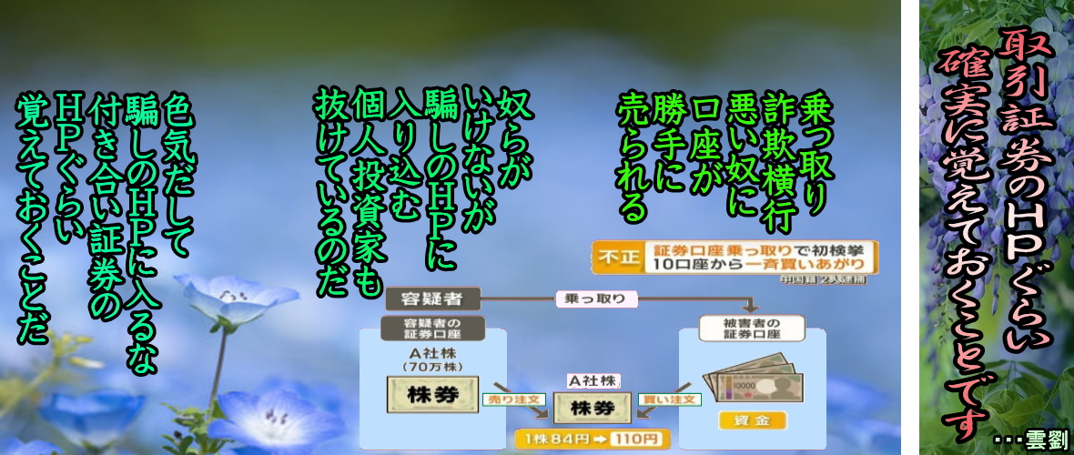 2025-04-06・・・日経より ◆口座乗っ取り国内株を売却する犯罪 犯罪集団「フィッシング」急増 複数銘柄で相場操縦疑い 楽天や野村、証券五社被害 楽天証券や野村證券など5社で顧客の証券口座が乗っ取られ、株を勝手に売買される被害が確認された。サイバー犯罪集団が株価を操作するために不正アクセスしたとみられ、売買対象には日本企業の株も含まれていた。公正な市場を害する相場操縦は金融商品取引法が禁じる違法行為だ。証券取引等監視委員会は動向を注視している。国内で個人が持つ証券口座は2024年12月時点で3743万口座に上り、3年で3割増えた。 少額投資非課税制度(NISA) の拡充など「貯蓄から投資」を促す政策をきっかけに株式運用の裾野は広がっており、証券取引の安全性を保つ対策が求められる。犯罪集団は証券会社をかたるメールを通じて偽サイトヘ誘導し、lDやパスワードを入力させて盗み取る「フィッシング」と呼ぶ手口を主に使ったとみられる。個人投資家のアカウントに不正ログインし、本人になりすまして株の売買ができるようになる。 口座が乗っ取られる被害の発生は楽天証券が3月下旬に公表した。同様の被害は5日までに、野村証券やSBI証券、SMBC日興証券、マネックス証券でも確認された。一連の不正売買は当初、香港や上海の取引所に上場する海外企業銘柄が中心だった。売買の原資は、乗っ取った証券口座で保有していた銘柄を売却するなどして得ていたとみられる。楽天証券やSBI証券は3月までに不正売買の疑いを把握し、中国株を巡る新規の買い注文の受け付けを停止した。両社とも段階的に対象銘柄を広げ、足元では計約1000銘柄に上る。 証券会社関係者によると、犯罪集団は中国株の購入停止措置を受け日本国内株に標的を切り替えた可能性が高い。乗っ取られた回座から買われた銘柄は価格が上昇した後に急落した。こうした不自然な値動きは国内の複数銘柄で確認されている。売買が薄く株価を動かしやすい銘柄を標的として、大量に購入して価格をつり上げた後で売り抜けて利益を得た疑いがある。 株価の変動を狙って他人の証券口座を悪用した事案は過去に例がないとされ、サイバー攻撃を絡めた新たな手口とみられる。金商法は証券市場での実態の伴わない売買や大量の注文によって意図的に株式や債券の価格を操る行為を「相場操縦罪」として禁じる。市場での公正な価格形成が妨げられれば、投資家の不利益につながるためだ。相場操縦罪には ①売りと買いの注文を同時に両方出す「仮装。なれ合い売買」 ②取引を成立させる意思がないのに大量に注文を出す「見せ玉」などで株価の変動を図る「変動操作」 ③株価を維持するために取引する「安定操作」の3類型がある。 2022年にSMBC日興証券の元幹部らが起訴された相場操縦事件はこの一つ互安定操作の類型が適用された。09年の早稲田大の投資サークルOBらによる事件は大量に出された虚偽の注文が変動操作に当たると判断された。今回発覚した不正売買もいずれかの類型に当たる可能性がある。 相場操縦罪の法定刑は10年以下の懲役もしくは1千万円以下の罰金または併科などと定められている。違反の疑いが強まれば監視委が調査する。一方、証券口座の乗っ取りは、他人のIDやパスワードを使いネット上の各種サイトに接続することを禁じる不正アクセス禁上法に違反する疑いが強い。 一部の被害者から相談を受けた警察当局が同法違反容疑を視野に情報収集を始めた。サイバーセキュリティー大手トレンドマイクロ(東京) によると、証券会社の偽サイトは2024年11月に大手2社のものが開設され、25年3月までに9社分ド拡大した。サイト数も急増しており、同社は複数のサイバー犯罪集団が関与しているとみている。
