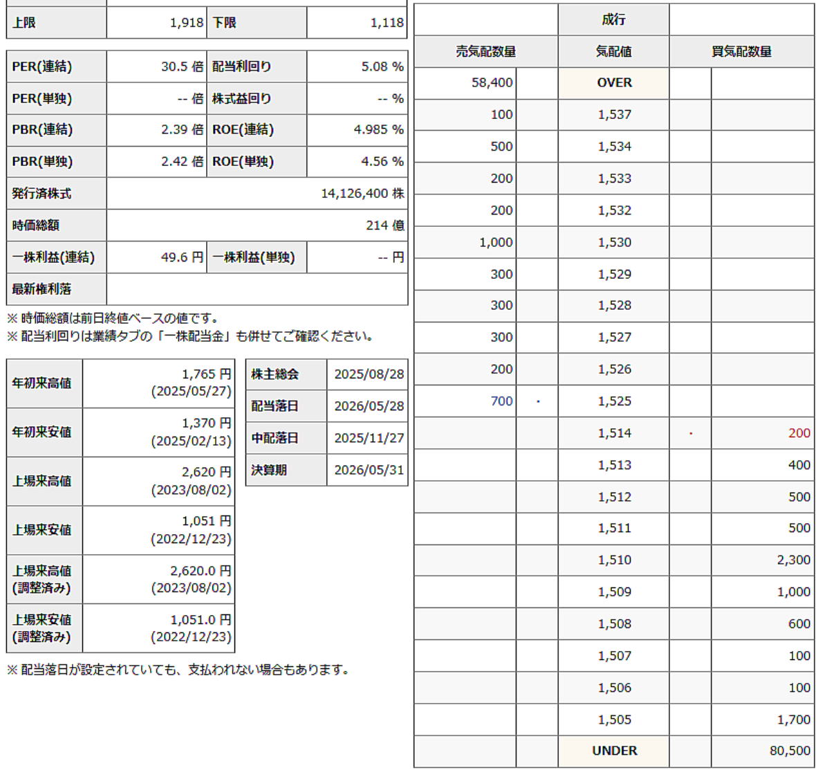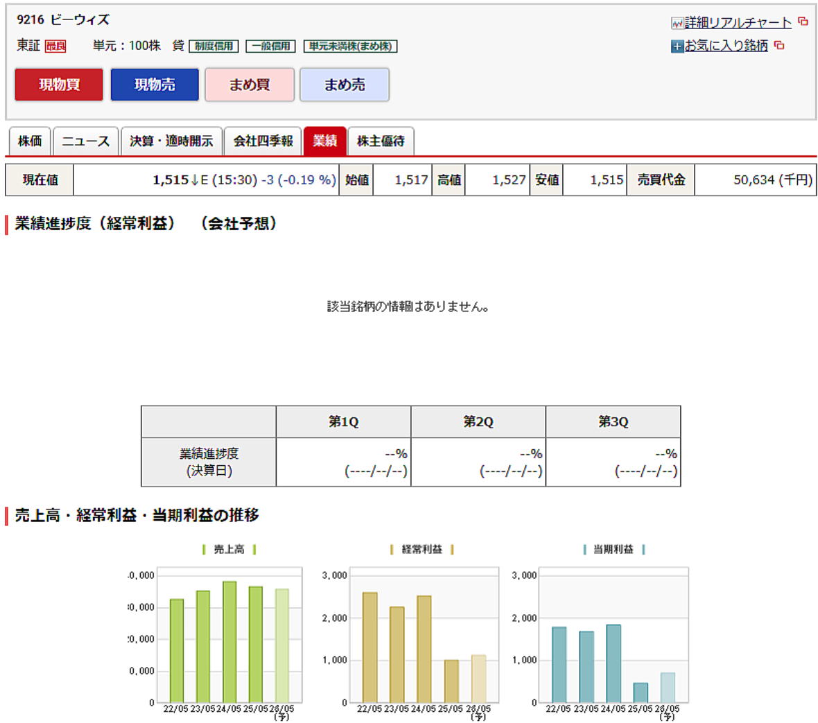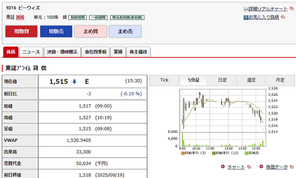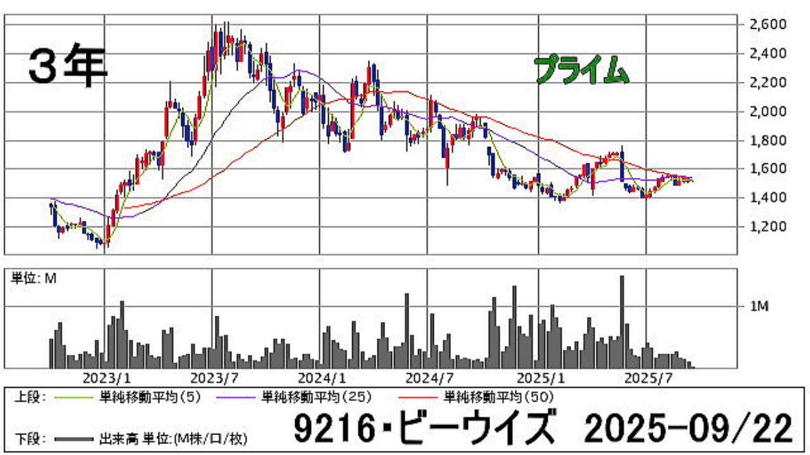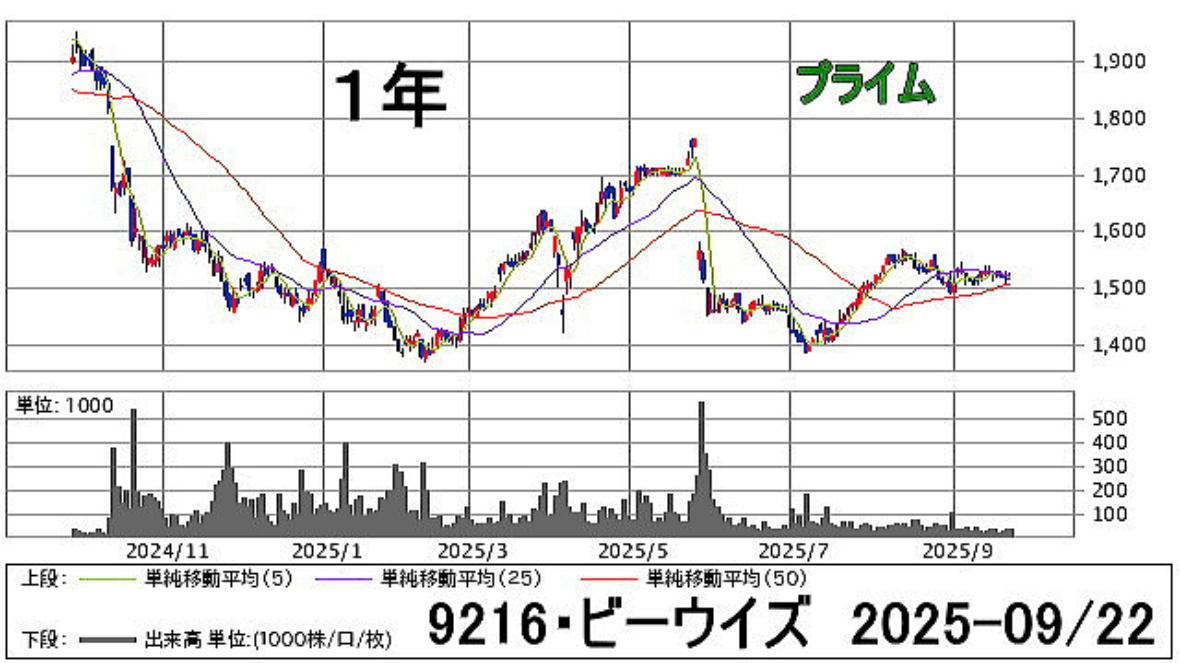 2025-09-22(月) ◆「9216・ビーウイズ」の株を買った ●私名義、200株、買値1515円 コスト1526円也 *買い成立時間、15時30分です 9/22(月) 終値=1515円 始値=1517円 高値=1527円 安値=1515円 前日比=-3円 騰落率=-0.19% 配当利回り=5.08% PER(連結)=30.5倍 一株利益(連結)=49.6円 日経平均 円= 45493.66円 NYダウ= 46381ドル 米ドル/円= 147.75円 ◆「9216・ビーウイズ」の株価チャート