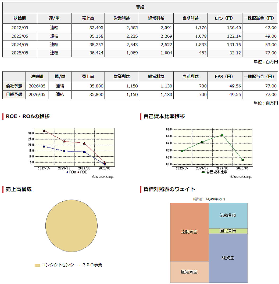 ●考察 2025年9月18日に発表された内容「上場維持基準への適合に向けた計画(改善期間入り)について」を読み、配当金も良く優待もあるので買ってみようかなと思い、200株買ってみた。 ◆会社内容 上場、2022.3 設立、2000.5 自社開発システムによるコールセンター運営に強み。同システムは外販も。パソナグループ。ビーウィズは、コールセンターの運営サービスを提供している会社である。顧客に最適なコールセンター環境をオーダーメイドで設計するほか、リアルタイム音声認識を強みとするコールセンターシステム「Omnia LINK」の開発や販売にも力を入れている。そのほか、AIやIoTなどデジタル技術を活用したアウトソーシングサービスを展開。定型業務の自動化や業務の品質向上などに一役買っている。 【回復緩慢】利益率よいシステム外販が大型案件増で好伸。ただ柱のコールセンター・BPOは地方電力開拓進むも、補助金対応関連の官公庁向け減少が響く。前半に拠点再編費用も膨らむ。営業益の回復緩慢。 【合理化】今上期中に大阪拠点縮小、他拠点もフロア削減模索。拠点再編による収益性向上急ぐ。注力中のシステム外販は人員再配置で営業やサポート体制強化の構え。 *本社、163-1032東京都新宿区西新宿3-7-1新宿パークタワーN棟 *【財務】・・・<単25年 *月>