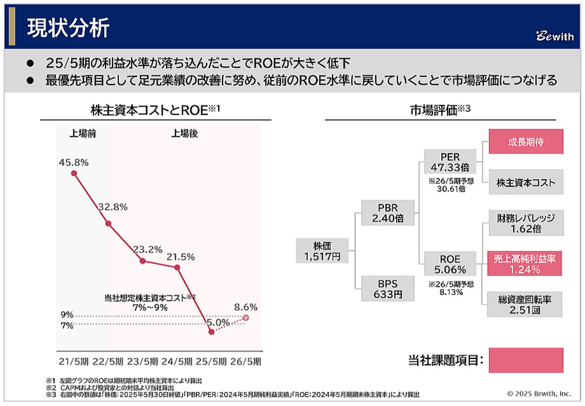 2.上場維持基準の適合に向けた取り組みの基本方針 当社グループでは、当社がプライム市場に上場していることは、社会やお客様からの知名度や信頼を 獲得し、持続的な成長と企業価値向上の実現のために重要な要素であると考えており、各種施策を推進 することで上場維持基準への適合を目指してまいります。具体的には、流通株式時価総額の構成要素で ある「時価総額」及び「流通株式比率」のうち、特に「時価総額」の向上に向けて、資本コストや株価 を意識し、成長戦略の実行による企業価値向上、株主還元、IR活動の充実等に取り組む方針です。 3.上場維持基準に適合していない項目の課題と取り組み内容 (1) 資本コストや株価を意識した経営に関する現状分析と優先課題 当社が投資家等との対話や当社における試算により認識している当社グループの株主資本コスト は7~9%程度でありますが、直近決算期である2025年5月期においては、特定の公共案件にお ける業務規模の縮小等によって売上高が伸び悩み、固定費の負担割合が大きくなったことにより 利益が減少したことで、ROEは5.0%となり、資本コストの水準を割り込んでおります。 一方で、 2022 年の上場に伴う増資による影響を受けていない2023年5月期および2024年5月期における ROE は20%強と、資本コストを大きく上回る水準であり、当社が最優先で取り組むべき項目として は足元業績の改善によりROEを高めていくことであります。また、2025年5月時点での市場評価 について株価を分解して分析を行うと、売上高純利益率が最大の課題であることが明らかであ り、それに伴うROEの低下が株価へ大きく影響していると考えております。 なお、2025年7月11日に開示いたしました2026年5月期の業績予想数値に基づく当期のROE 予想は8%台となっており、株主資本コストと同水準まで回復することを見込んでおります。2027 年5月期以降についても業績改善の取り組みを中心に、従来の水準であった20%強のROE水準への 回復を目指していく考えです。 加えて、当社の成長ドライバーであるOmnia LINK外販事業の拡大を着実に進めることで投資家 からの成長期待を高め、PER向上への取り組みも並行して進めてまいります。