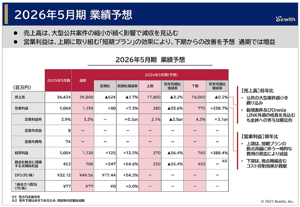 (2) 課題および取り組み内容 ① 業績の回復に向けた課題と取り組み 前述のとおり、当社グループの2025年5月期の業績は、2024年5月期から低下している状況に ありますが、2025年7月11日に開示いたしました2026年5月期の業績予想数値のとおり、当期 においては増益を予想し、ROEも増加する計画です。当社グループでは、当期の計画を実現する ために、下記の取組を進めてまいります。 A) コンタクトセンター・BPO事業における売上高の確保 前期から引き続き、特定の公共系案件については、当期においてもその業務規模の縮小が見 込まれますが、当社の注力領域であるスマートライフ領域(金融・情報通信・小売流通の各 業界)を中心としたリソースの集中と営業戦略の実行に取り組みます。 B) 売上高水準に見合う筋肉質な体制の実現 現在の当社グループでは、2025年5月期以前より実行してきた成長投資(人材・拠点・シ ステム等)によって固定費水準が高い状況となっております。当期の計画においては、2025 年5月29日に開示いたしました「業績回復に向けた短期プラン」の実行により、上期を中 心に人材リソースや拠点席数の最適化を進め、下期においては売上高の水準に見合ったコス ト構造を実現することで、利益創出に取り組みます。 C) Omnia LINK 外販事業の成長 当社における成長ドライバーであり、価値の源泉となっているOmnia LINK 外販事業につい て、体制の強化やシステムとしての機能強化に取り組み、大規模顧客の獲得を進めていくこ とで、成長をより加速させるとともに、全社業績に寄与する利益の創出を実現してまいりま す。