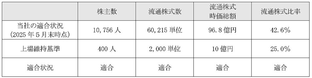 当社は、2025 年5月時点において、東証プライム市場における上場維持基準に適合しない状態となり ました。下記のとおり、上場維持基準への適合に向けた計画を作成しましたので、お知らせいたします。 1.当社の上場維持基準への適合状況、 計画期間及び改善期間 当社の2025年5月31日時点における東証プライム市場の上場維持基準への適合状況は、下表のとお りとなっており、流通株式時価総額については基準に適合しておりません。 当社は、今回不適合となっ た基準を充たすために、上場維持基準への適合に向けた各種取組みを進めてまいります。 なお、流通株式時価総額基準について、2026年5月31日までの改善期間内に適合していることが確 認できなかった場合には、東京証券取引所より監理銘柄(確認中)に指定されます。その後、当社が提 出する2026年5月31日時点の分布状況表に基づく東京証券取引所の審査の結果、基準に適合している 状況が確認されなかった場合には、整理銘柄に指定され、当社株式は2026年12月1日に上場廃止とな ります。 当社は、前述のとおり、プライム市場の上場維持基準への適合を第一に目指してまいりますが、今後 の事業環境の変化等により、上場維持基準への適合が困難となる可能性が高まった場合に備え、スタン ダード市場への市場区分の変更も選択肢の一つとして検討しております。