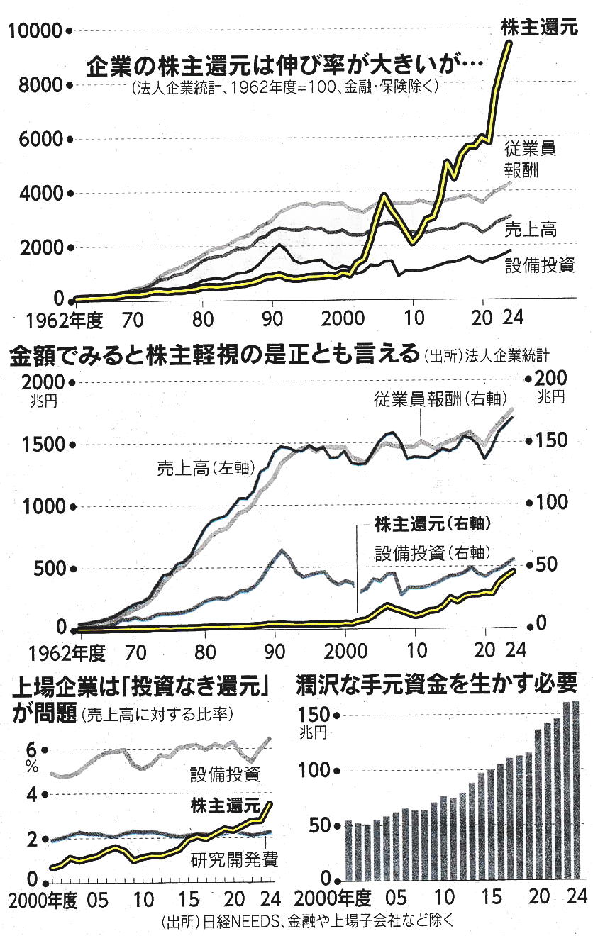 2026-02-16・・・日経より ◆0、資本騒乱、誰のための市場か、 株式還元、成長で増やす 欧米の追随―巡「効率改善目的」先細り 企業の株主還元に政官界の厳しい視線が注がれている。人件費や設備投資を抑制しながら株主還元ばかり増やしているとの批判だ。確かに還元は2000年度と比較して9倍に増えたが、市場を重視する経営にシフトするなかで底上げされた側面が強い。その流れは一巡しつつあり、今後は成長を伴う還元拡大につなげていく必要がある。「株主還元を求める声の大きさに萎縮し、新事業への投資を滞らせてしまつているようにも見える」。 2025年5月、産業構造審議会(経済産業相の諮問機関)は、企業経営に疑間を投げかけた。アベノミクスの一環として政府が進めたコーポレートガバナンス(企業統治)改革は、企業に稼ぐ力を示す自己資本利益率(ROE) の引き上げを求めた。企業は不要な資金を抱えて資本効率が落ちないよう株主還元を増やした。株主還元への批判が高まったのは20年ごろからだ。岸田文雄政権の「新しい資本主義」は、株主第一主義からの転換を唱えた。 理論面で支えた早稲田大学のスズキ・トモ教授は企業の資金の使い道をひとつのグラフにし、耳目を集めた。2000年度と比べた売上高や従業員報酬の伸びは2割にとどまり、設備投資は4割増に抑えられた。その間、株主還元は9倍に膨らんだ。このグラフを金額に直すと異なるストーリーが浮かぶ。かつての日本企業は銀行からの借り入れが資金調達の主体で、経営者は株式持ち合いに守られていた。 1990年代まで企業は株主を重視せず、配当の水準は低かった。銀行を向いた経営から市場に軸足を置く経営に転換するなかで株主重視の姿勢を強めた。欧米と比べた還元の少なさの是正が20年あまりかけて進んだ。経済協力開発機構(OECD)のデータにもとづく国内総生産(GDP)統計べースで比較すると、日本企業の稼ぎの従業員・出資者への分配のうち株主還元は20年前は3%だった。 これが15% に高まり、20%前後の欧州各国に近づいた。16% の米国はこの統計に反映されない自社株買いが多い。大和総研の神田慶司シエアエコノミストは「日本企業の株主還元に欧米に追いつきつつある段階で行き過ぎではない」と指摘する。課題はある。企業は前向きな投資よりもまず資本効率政善に注力してきた。不採算事業や不要な土地・株式を売却して得た資金を還元したり、配当性向を引き上げたりして内部留保を抑える動きが強まった。 アクテイビスト(物言う株主)は余剰資金は株主に返せと圧力をかけ、蓄積をはき出す「引き算」の経営改革のイメージが強くなった。日本共創プラットフォームの冨山和彦会長は「還元にばかり走る企業の経営者は『有望な投資機会を見いだす能力はありません』と、自ら職務を放棄しているに等しい」と指摘する。より重要なのは、株主を手っ取り早く納得させるための逃げ道の還元ではなく、成長機会を探し出して投資した成果としての「足し算」の還元とみる。 上場企業の資金の使い道を分析すると、売上高に対する研究開発費の比率は2% 強と横ばいが続く。20年度ごろから株主還元を下回るようになった。設備投資の対売上高比率も5~6%前後で横ばいが続いており、「投資なき還元」の色彩が強い。ガバナンス改革による資本効率の引き上げは必須の取り組みだ。バブル期には野放図な投資が後の損失につながった。「資本効率が低い事業投資しても持続性はない宍冨山氏)。 日本企業は不採算事業から撤退して資本効率を高めながら、新たな事業やサービスを生み出す投資に重心を移すときだ。企業が生む富が経済を豊かにし、同時に株主還元も増える形に脱皮しなければ批判は収まらない。(真鍋和也、村上徒紀郎)
