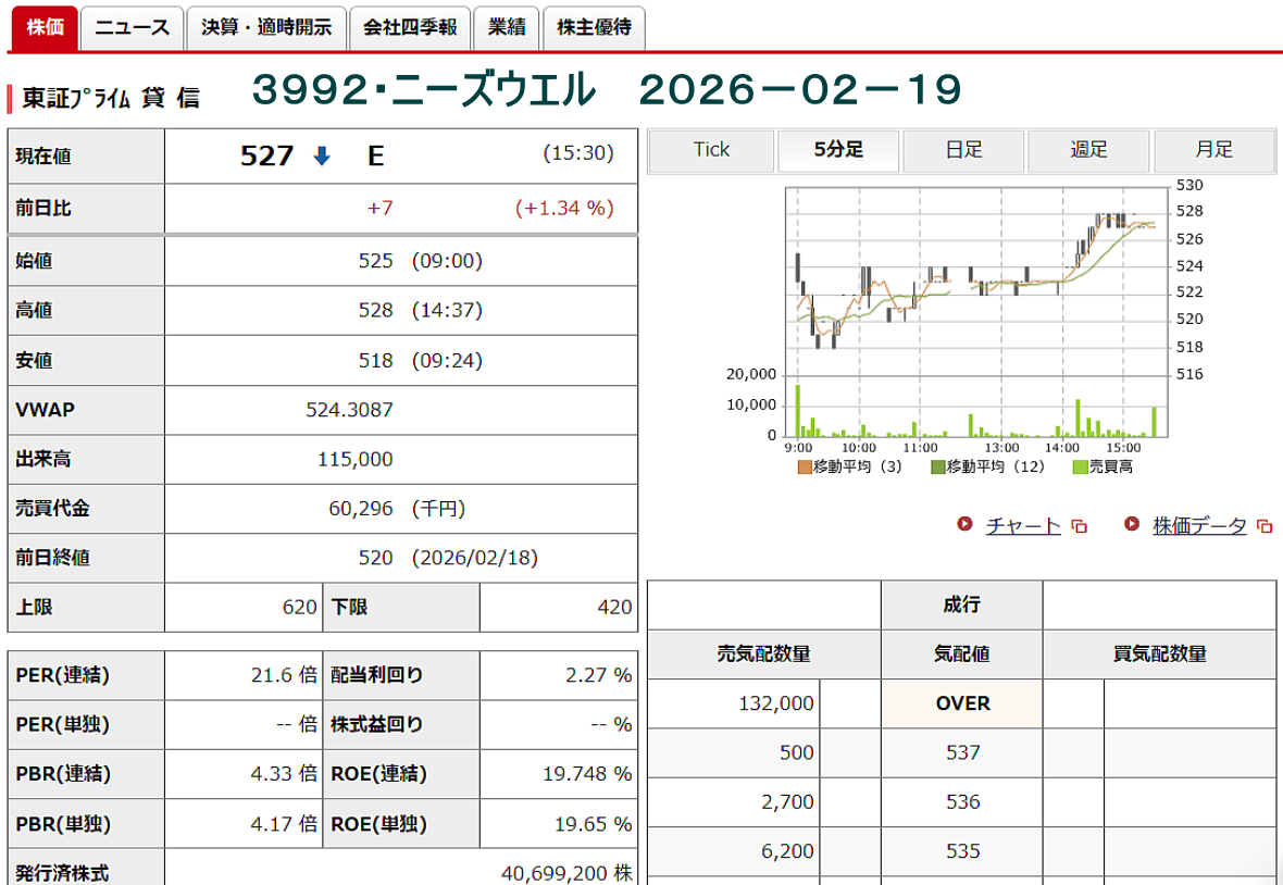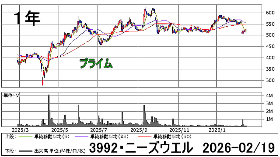 2026-02-19(木) ◆「3992・ニーズウエル」の株を買った ●妻名義、1000株、買値524円 コスト528円也 *26.2/19 終値=527円 始値=525円 高値=528円 安値=518円 前日比=+7円 騰落率=+1.34% 配当利回り=2.27% PER(連結)=21.6倍 一株利益(連結)=24.3円 日経平均 円= 57467.83円 NYダウ= 49662ドル 米ドル/円= 154円 ◆「3992・ニーズウエル」の株価チャート
