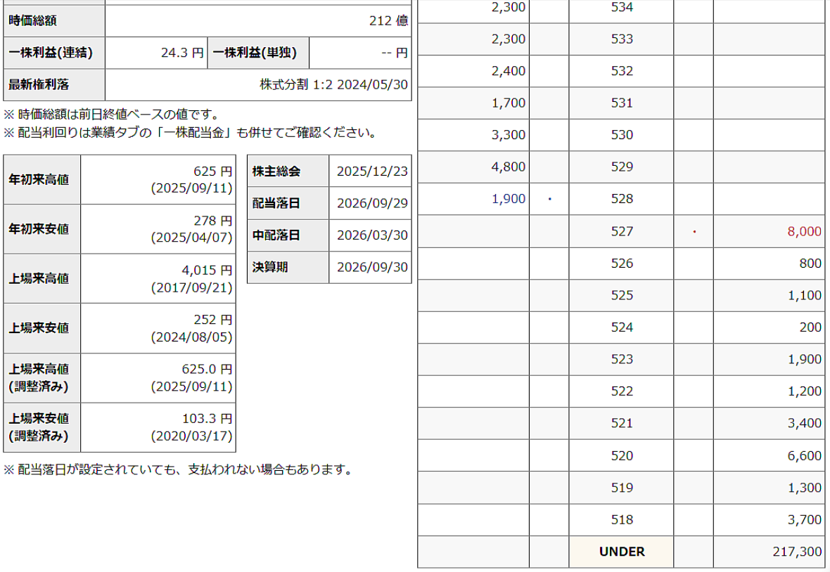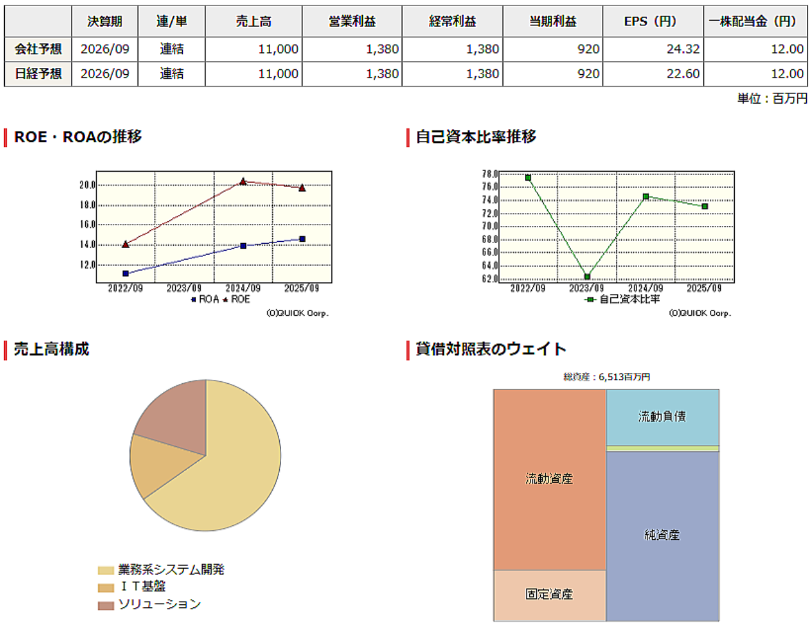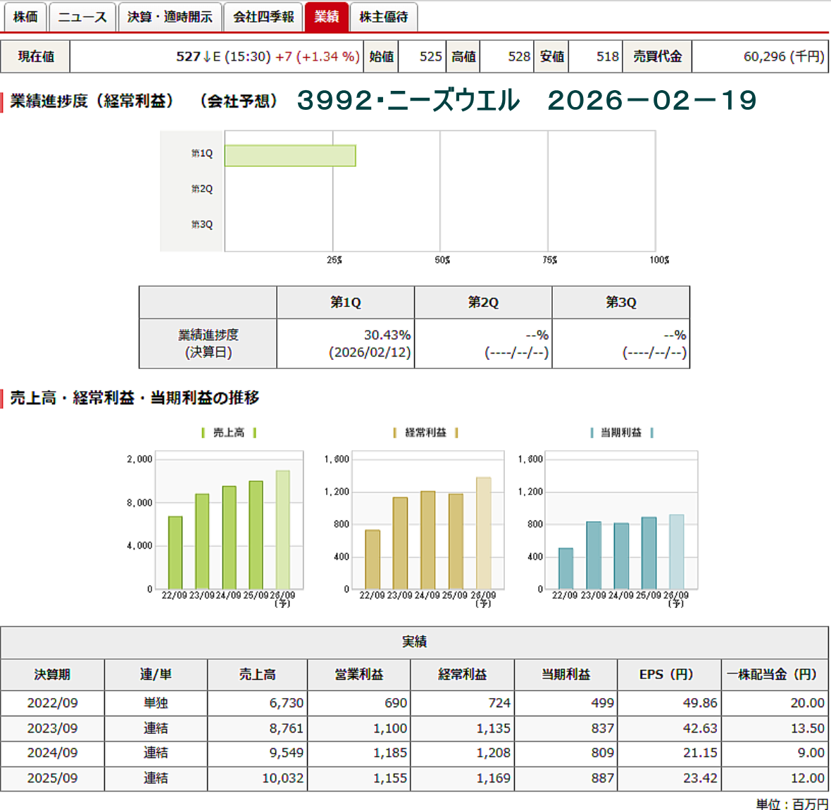 ◆株主優待(2026年2月12日発表) *権利確定、 3月・ 9月 【変更前(現行)】 ≪基準日≫ 毎年3月31日および9月30日(年2回) ≪対象株主≫ 基準日時点の当社株主名簿に記載または記録された1,000株 (10単元)以上を保有する株主を対象とする。 ≪優待内容≫ QUOカードを以下の通り贈呈する。 1,000株(10単元)以上 基準日ごとにQUOカード15,000円分 【変更後】 ≪基準日≫ 毎年3月31日(年1回) ≪対象株主≫ 基準日時点の当社株主名簿に記載または記録された 1,000株(10単元)以上を継続して1年以上保有する株主を対象とする。 ≪優待内容≫ 1,000株(10単元)以上 QUOカード 15,000円分 注1.毎年3月末日を基準日とし、当社株主名簿に記載または記録された 1,000株(10単元)以上保有の株主のうち、 継続して1年以上保有する株主を対象とする。 注2.「継続して1年以上保有する株主」とは、 毎年3月末日および9月末日現在の当社株主名簿において、同一の株主番号で 3回以上連続して1,000株(10単元)以上の保有が記載または記録されている株主とする。 ≪贈呈時期≫ 基準日から3か月以内を目途に発送する。 【変更適用日】 2026年4月1日 2026年3月31日の基準日においては、変更前の制度を適用する。 *具体例) [2026年3月31日時点の株主]1,000株以上保有の株主が対象となる。 [2026年9月30日時点の株主]優待制度変更後は9月の株主優待はない。 [2027年3月31日時点の株主] 1,000株以上を同一株主番号で1年以上(2026年3月期以降)保有している株主が対象となる。 ◆「3992・ニーズウエル」の業績
