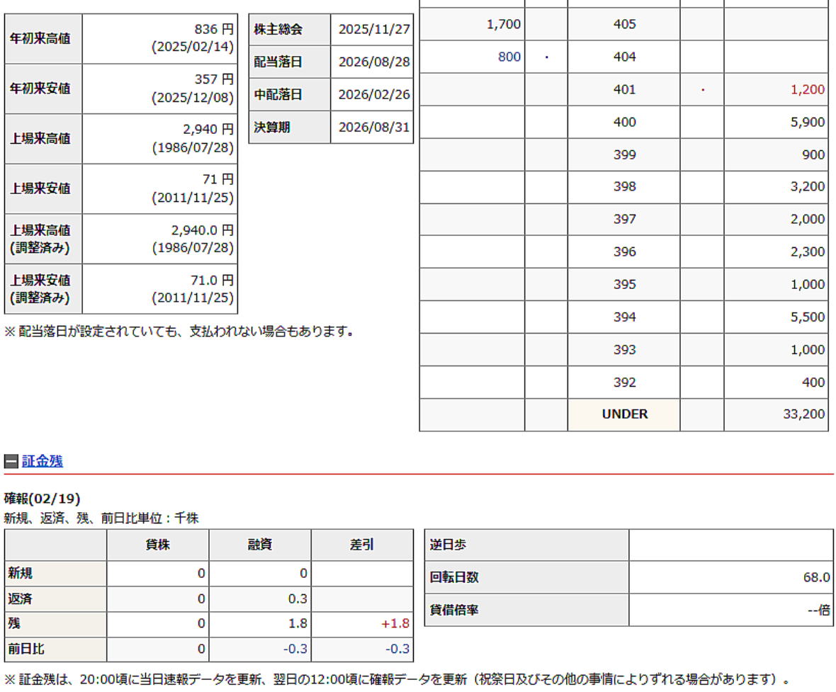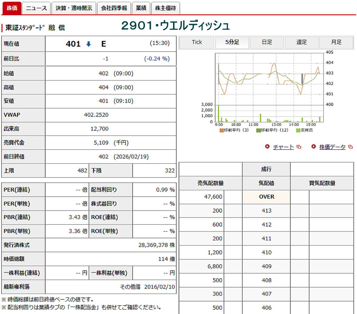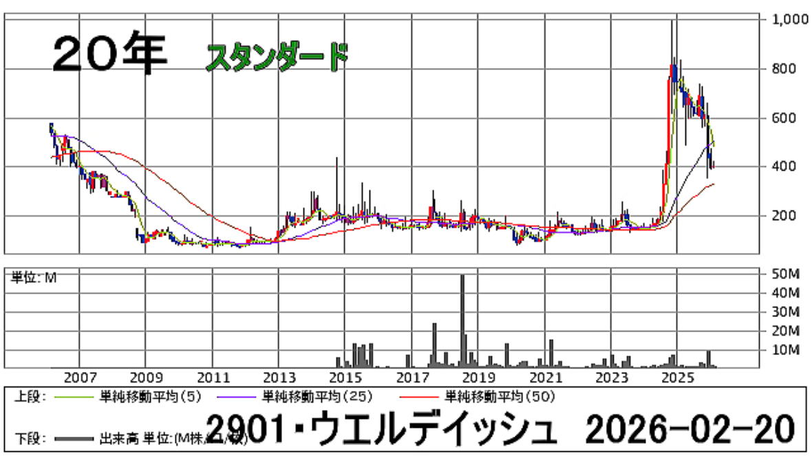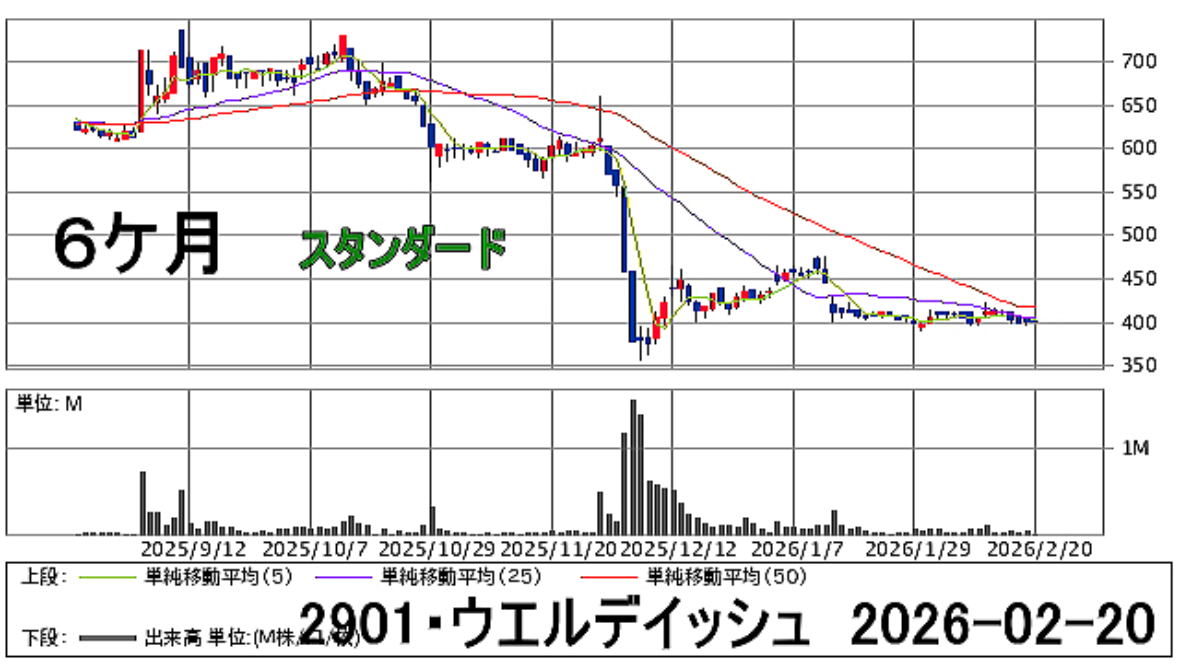 2026-02-20(金) ◆「2901・ウエルディシュ」の株を買った ●妻名義、300株、買値402円 コスト407円也 *2/20 終値=401円 始値=402円 高値=404円 安値=401円 前日比=-1円 騰落率=0.24% 配当利回り=0.99% PER(連結)=--倍 一株利益(連結)=--円 日経平均 円= 56825.7円 -642.3 NYダウ= 49395ドル 米ドル/円= 155円 ◆「2901・ウエルディシュ」の株価チャート