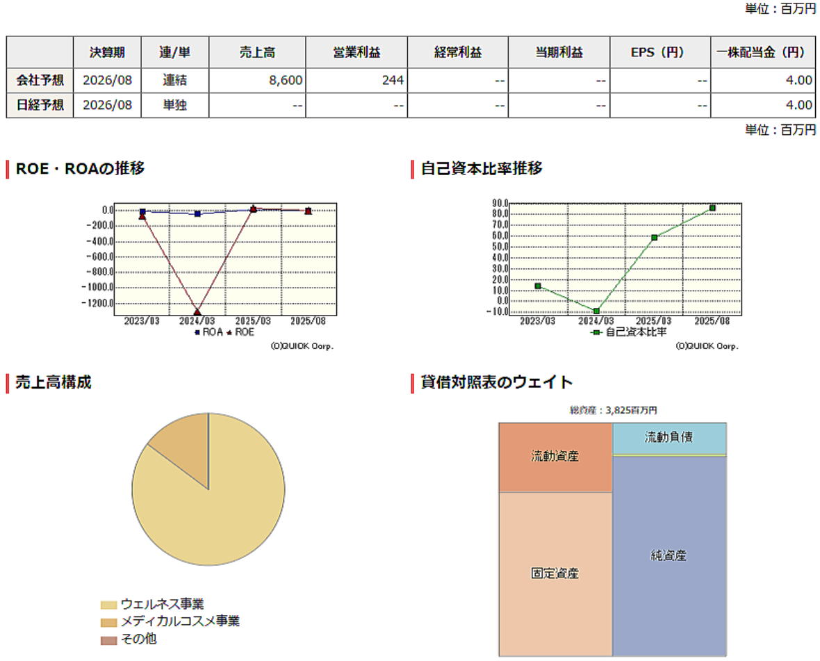 ◆株主優待(2025年6月6日発表) *権利確定、 2月・ 8月 ≪対象株主≫ 毎年8月31日現在、2月末日現在の株主名簿に記載された株主を 対象とする。 ≪優待内容≫ 【8月31日・2月末日基準】 所有株式数300株以上の株主を対象に、8月31日現在及び2月末日現在を 基準日とした株主名簿において継続保有が確認された方を対象に、 継続保有期間に応じて下記の額のQUOカードを贈呈する。(※1) 半年以上の継続保有者 5,000円ずつ年合計10,000円分。 2年以上の継続保有者 10,000円ずつ年合計20,000円分。 【8月31日基準】(※2) 所有株式数3,000株以上の株主を対象に20,000円相当の当社商品詰合せを、 また、同対象の方のうち毎年8月31日現在を基準日とした株主名簿において、 決算期変更日以降3年以上継続保有が確認された方に、100,000円分の食品・ 飲料・栄養補助食品等(有事にも活用可能な保存食や栄養サプリメント含む)を贈呈する。 ※1 2025年8月末日以降を起点に継続保有期間を確認する。 ※2 2025年3月31日現在の株主名簿を対象に優待が実施された ことを鑑み、2026年8月31日以降に実施する。 ≪贈呈時期≫ 毎年8月31日現在、2月末日現在の株主名簿を基準として記載または記録された 株主を対象にそれぞれ12月中旬頃、6月中旬頃に、贈呈する。 【適用時期】 2025年8月31日現在、 2026年2月28日現在の株主名簿を基準として記載または記録された株主より対象とする。 ◆「2901・ウエルディシュ」の業績